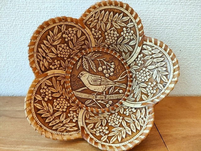 【BE313】北欧ロシア雑貨、ベレスタ・白樺の小物入れ ウソとナナカマド皿型ベレスタ