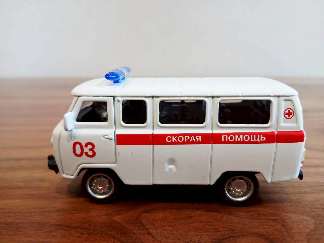 ロシアのミニカー(モデルカー)です。ウリヤノフスク自動車工場(ワズ社)の、愛称が「ブハンカ」というUAZマイクロバスの車種です。緊急医療車両です。