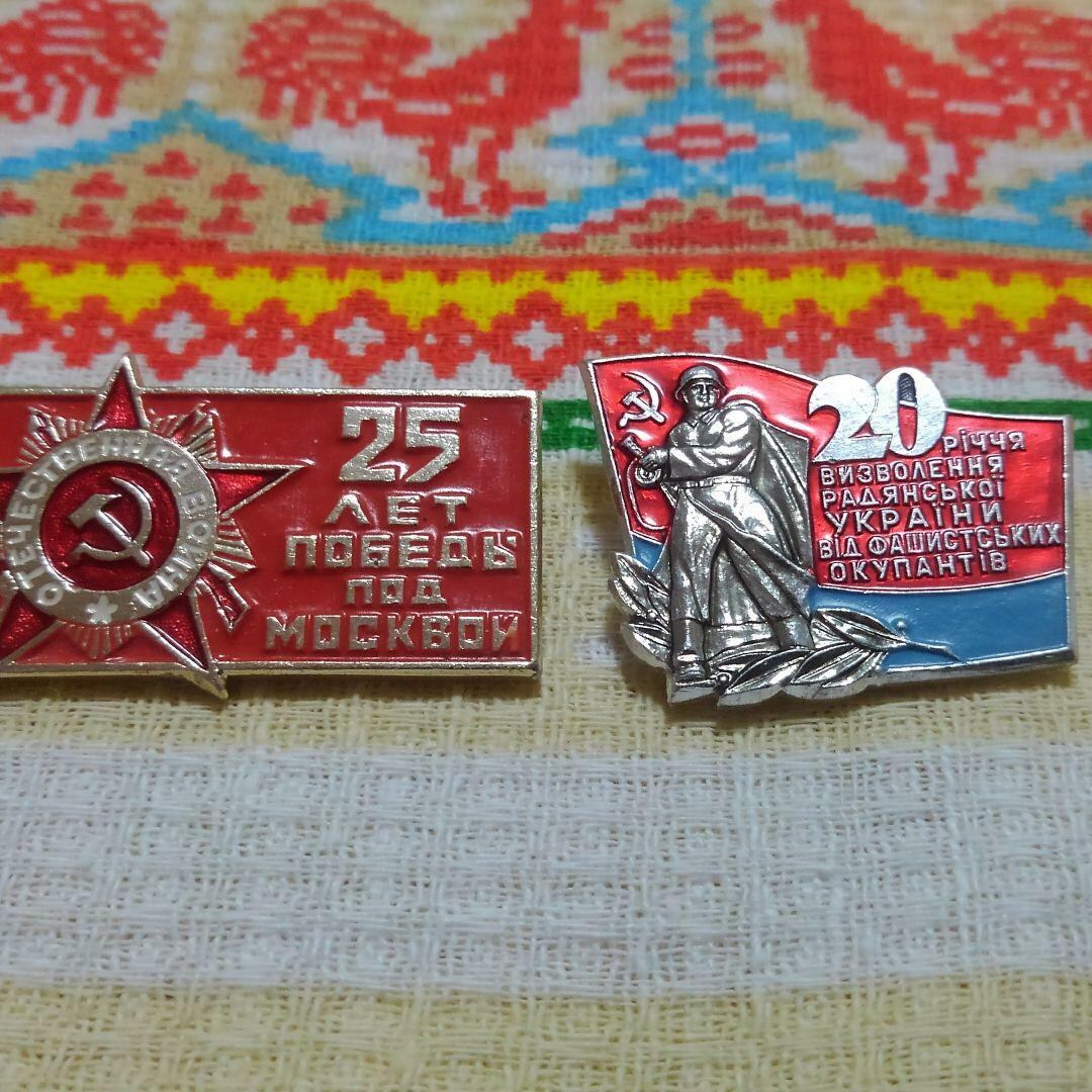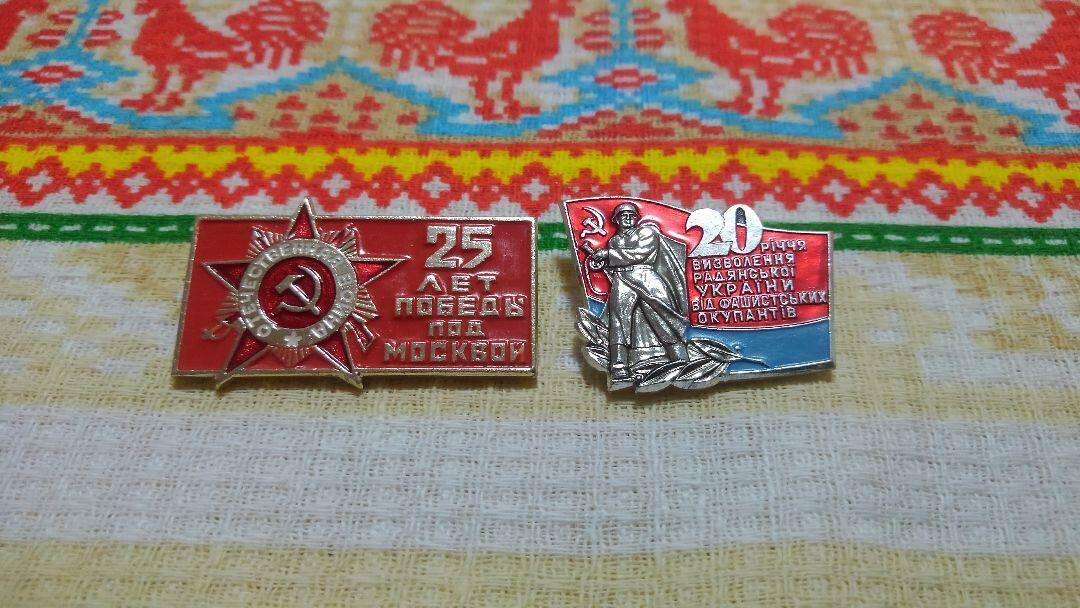 バッジの原題: 25 лет победы под Москвой и 20 лет освобождения Украйны. 2шт. одним лотом