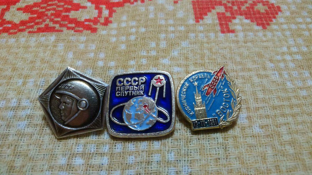 ソビエトの宇宙開発をモチーフにしたバッジ3個です。左端のバッジはユーリー・ガガーリン大佐、真ん中は人工衛星スプートニク、右端はガガーリンを乗せたボストークロケットが描かれています。
