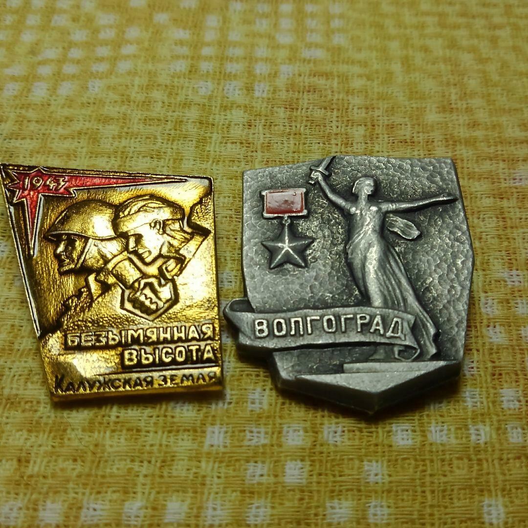(左)1943年にロシアのカルーガ(州)はナチスドイツから完全に解放されました。バッジにはロシア語で「名もなき丘」と書かれています。カルーガの丘は激戦地の一つであり、「名もなき丘で」という歌は今でもロシアで祝日に歌われています。