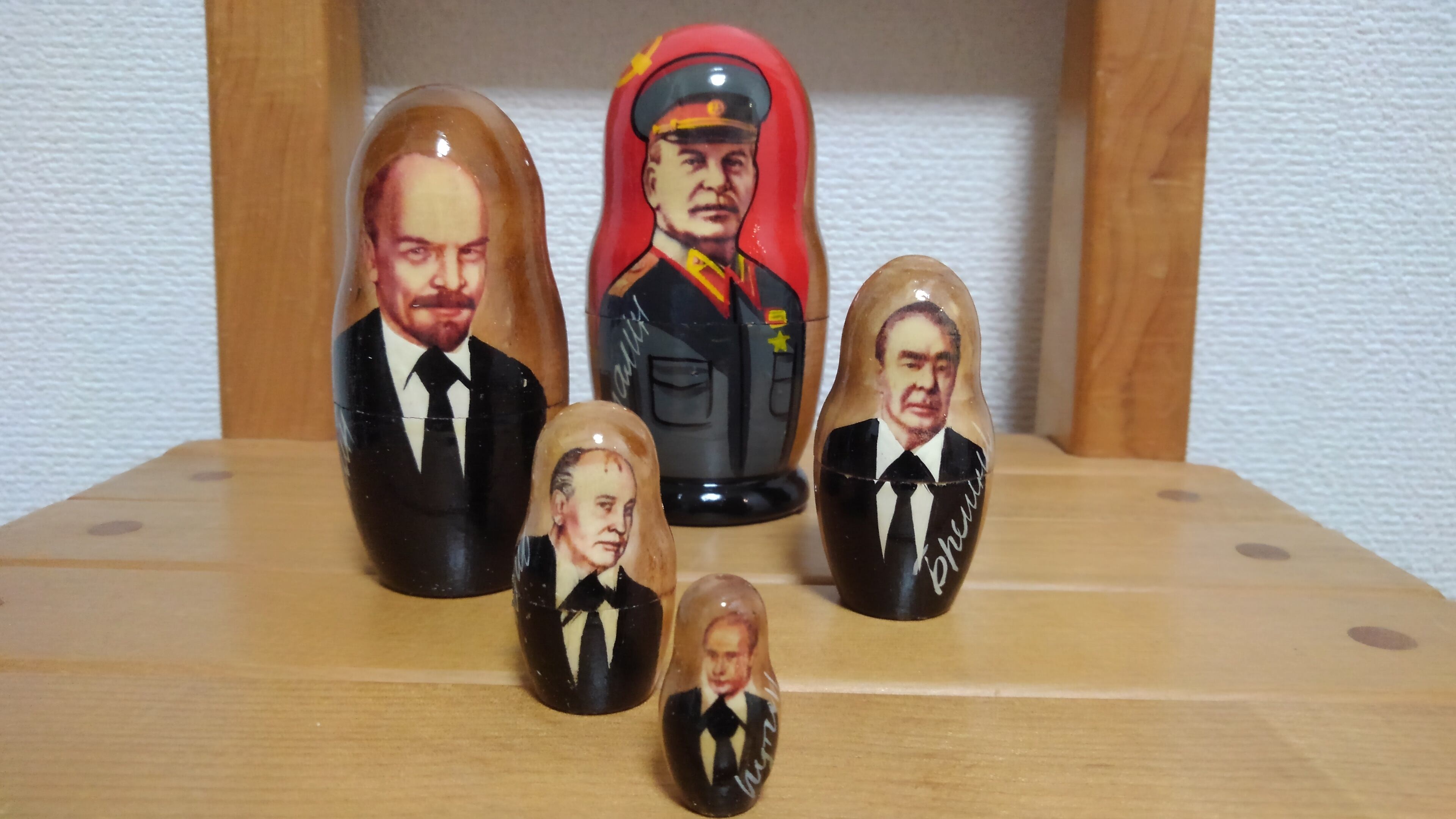 スターリン、レーニン、ブレジネフ、ゴルバチョフ、プーチンのマトリョーシカです。