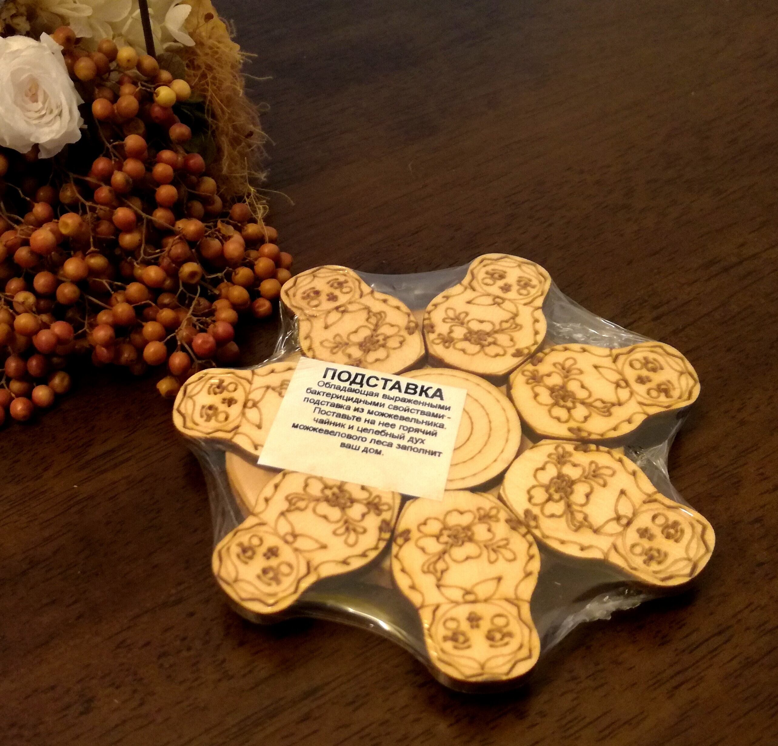 モジェベレニクと呼ばれるロシアの伝統工芸品のコースターです。ヒノキ科の木で、檜木の良い香りがします。マトリョーシカがモチーフになっています。