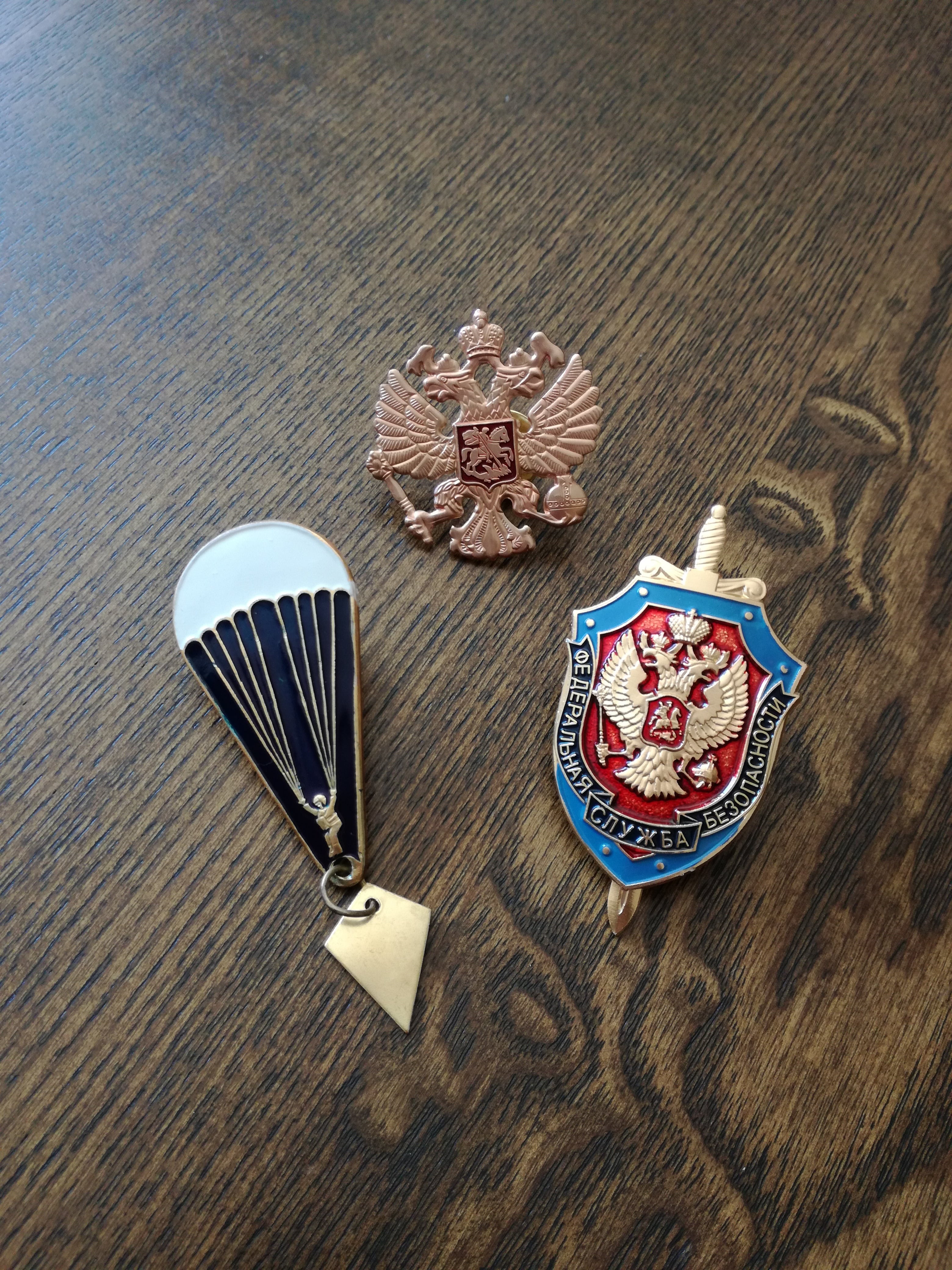 双頭の鷲などのシンボルが入っているバッジです。左はロシア空挺軍の落下傘降下部隊(パラシュート部隊)をモチーフにしています。