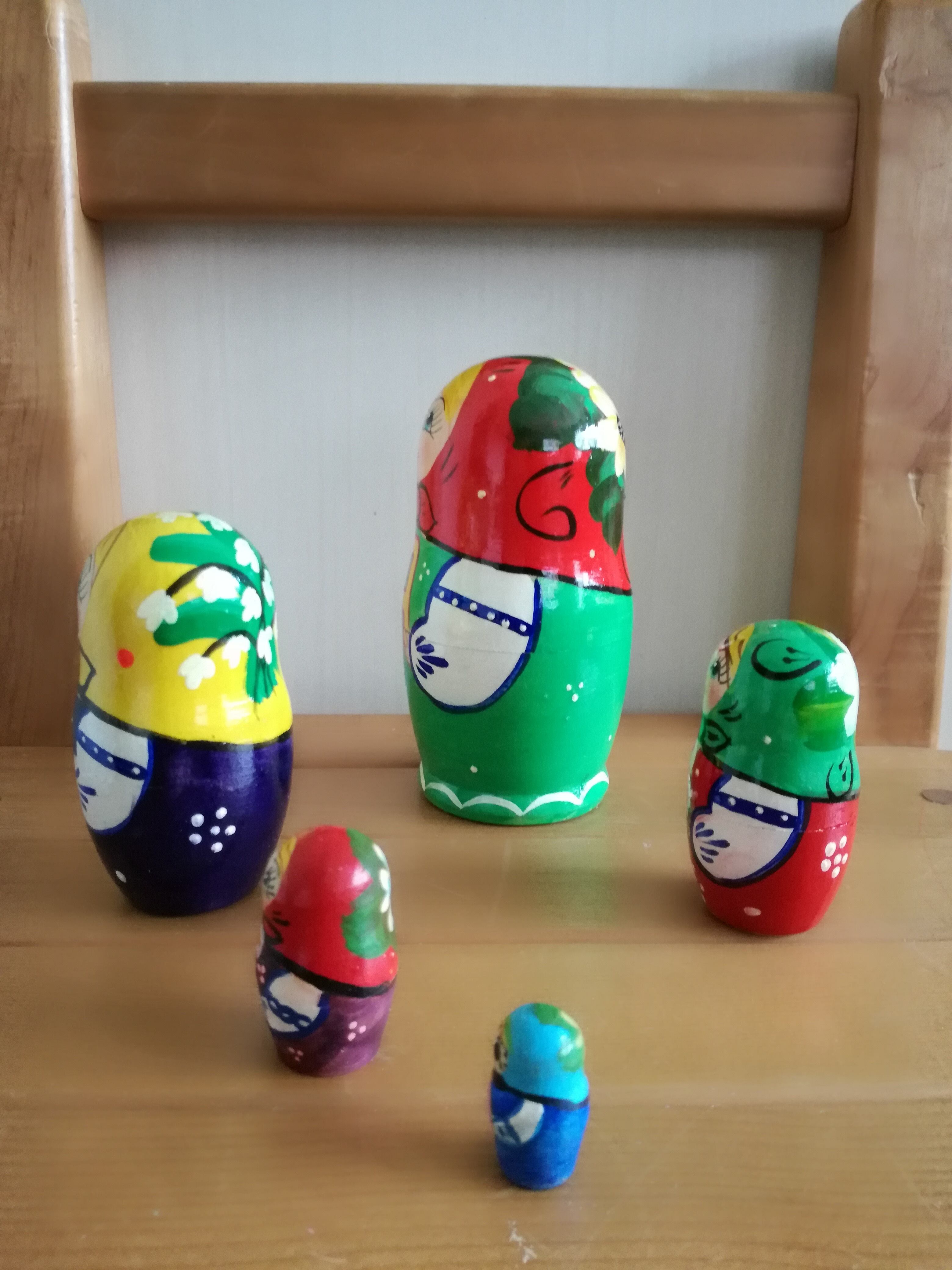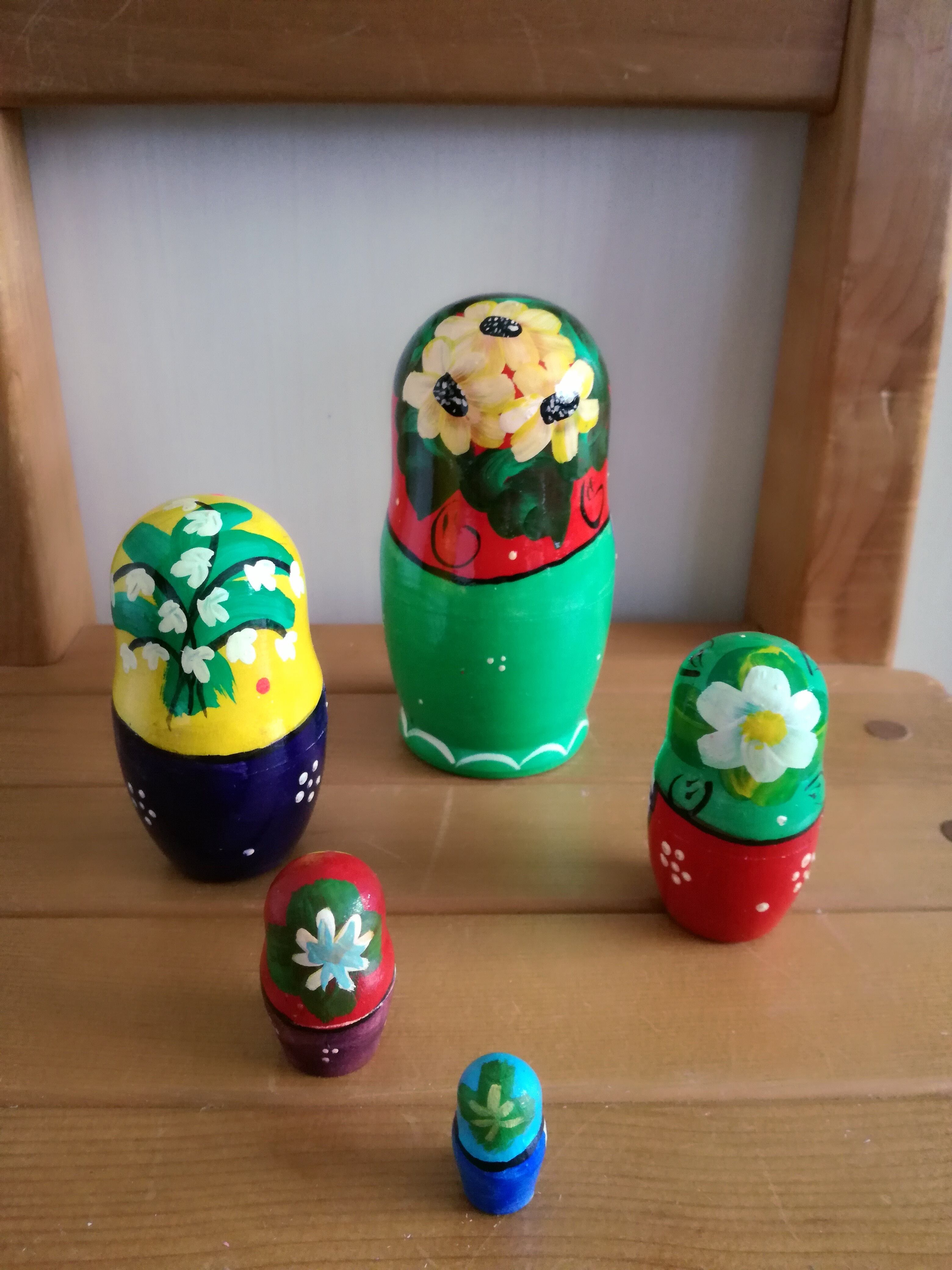 日本製ではないため、マトリョーシカは新品であっても間近で眺めると絵柄のハネや飛び、絵具のはがれ、また本体内部の木のシミ等がある場合がございます。(インテリアとして普通の距離から眺める分には問題ありません)。日本の木製作品ような完璧な仕上がりをお求めの方は、高価格帯のマトリョーシカをお買い求めくださいm(__)m