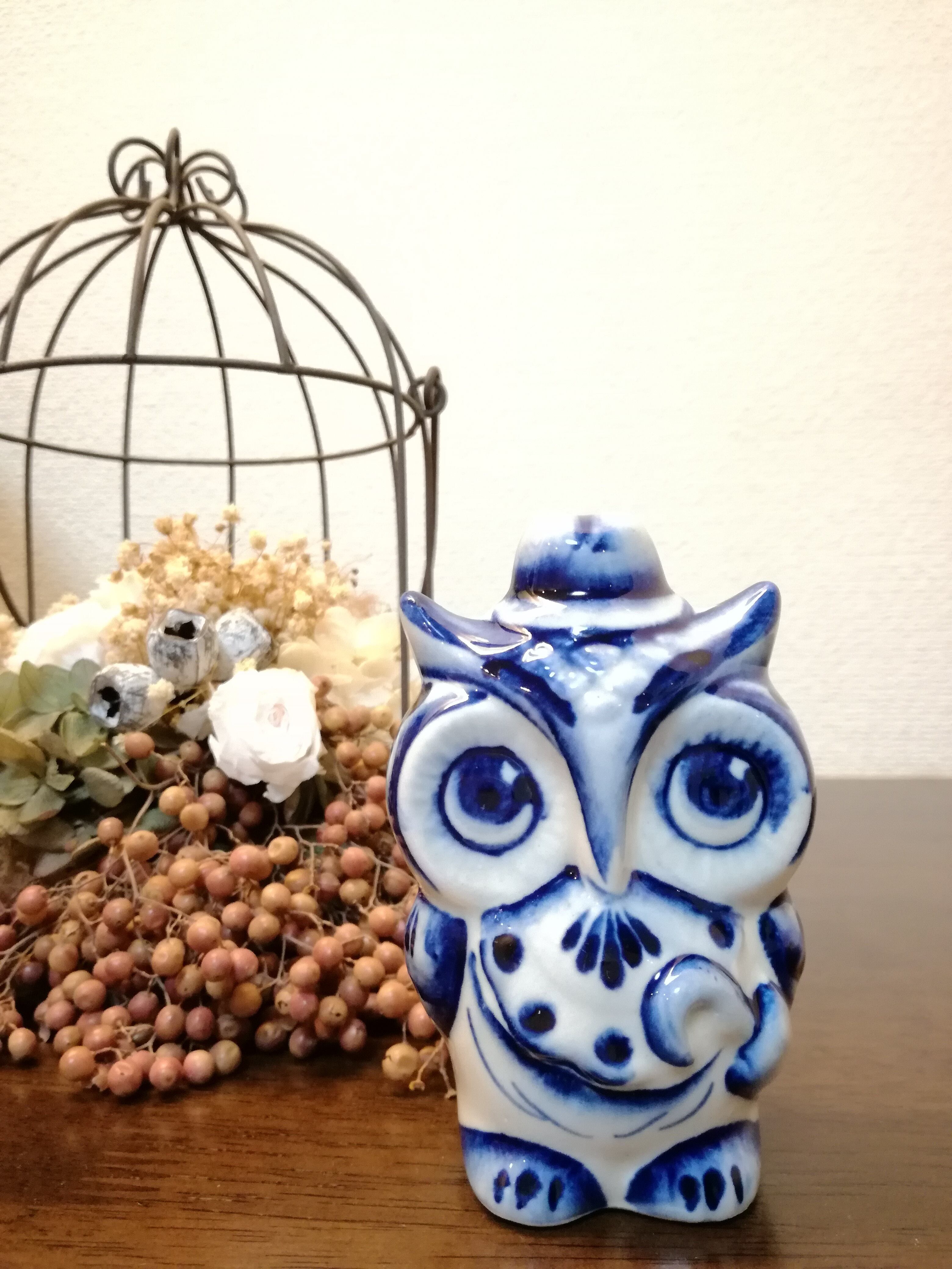 ◆商品説明:ロシアの伝統陶器、グジェリ焼です。ミミズクがモチーフで傘を持っています。フクロウや動物が好きな方への贈り物にいかがでしょうか?