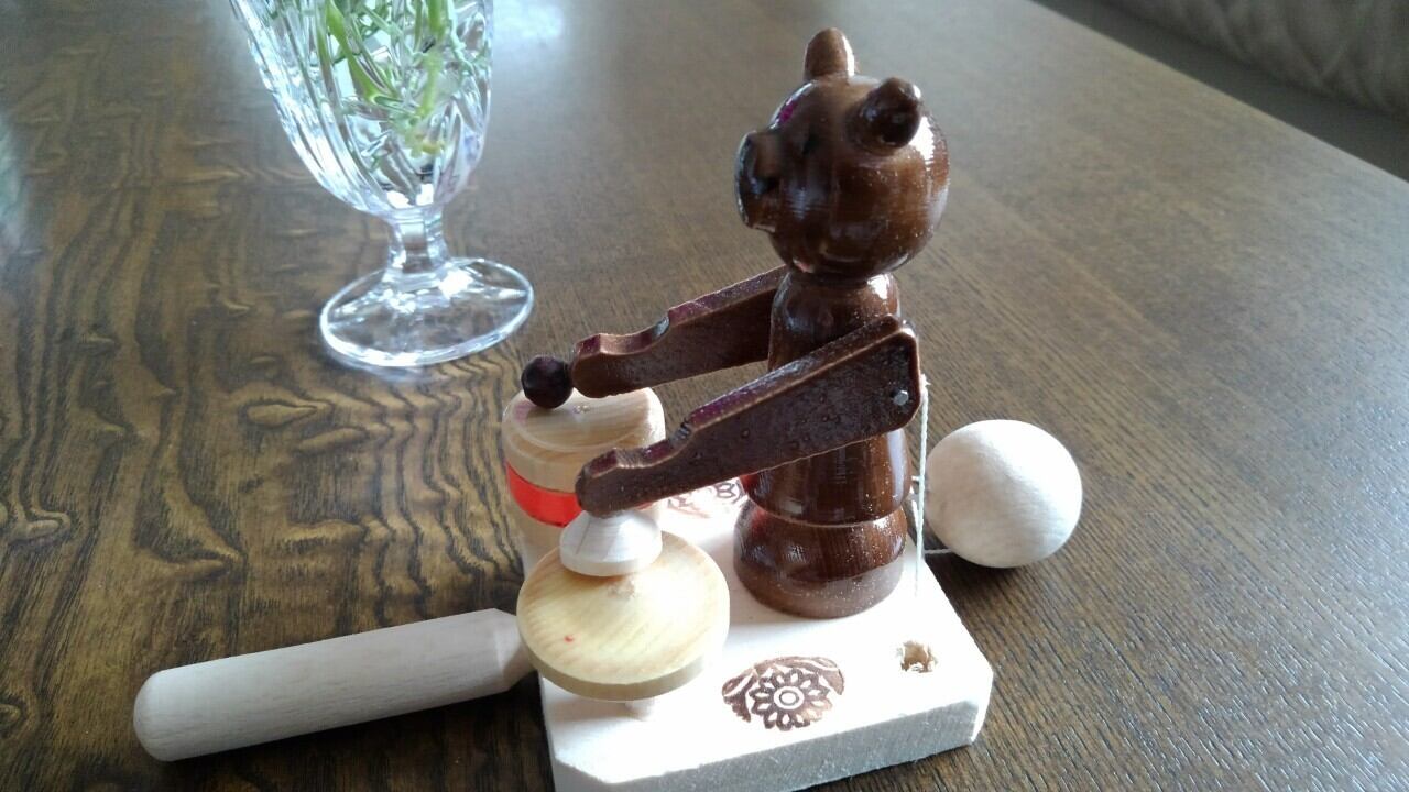 ◆商品説明:ロシアの木製操り人形です。後ろの紐についている玉を振り子のように左右に振ると、クマの両手がカタカタと上下に動き、楽器を叩く仕草をします。