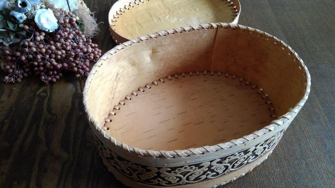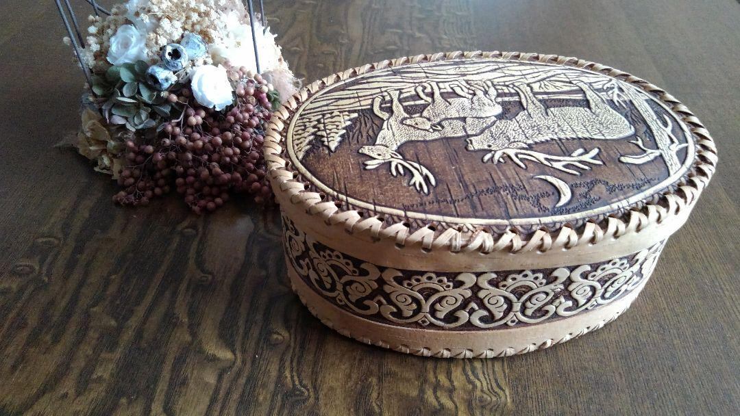 ロシア・北欧の小物入れ、ベレスタです。白樺の真皮で作られている白樺細工です。トナカイをモチーフにしています。