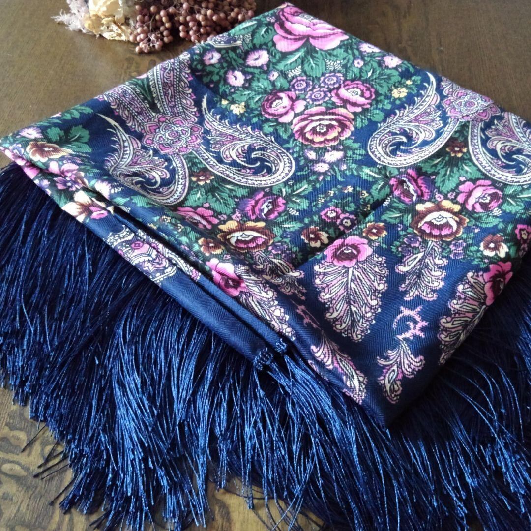 青色、花柄のプラトーク(スカーフ、ショール、ストール)です。結構大きいです。