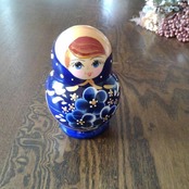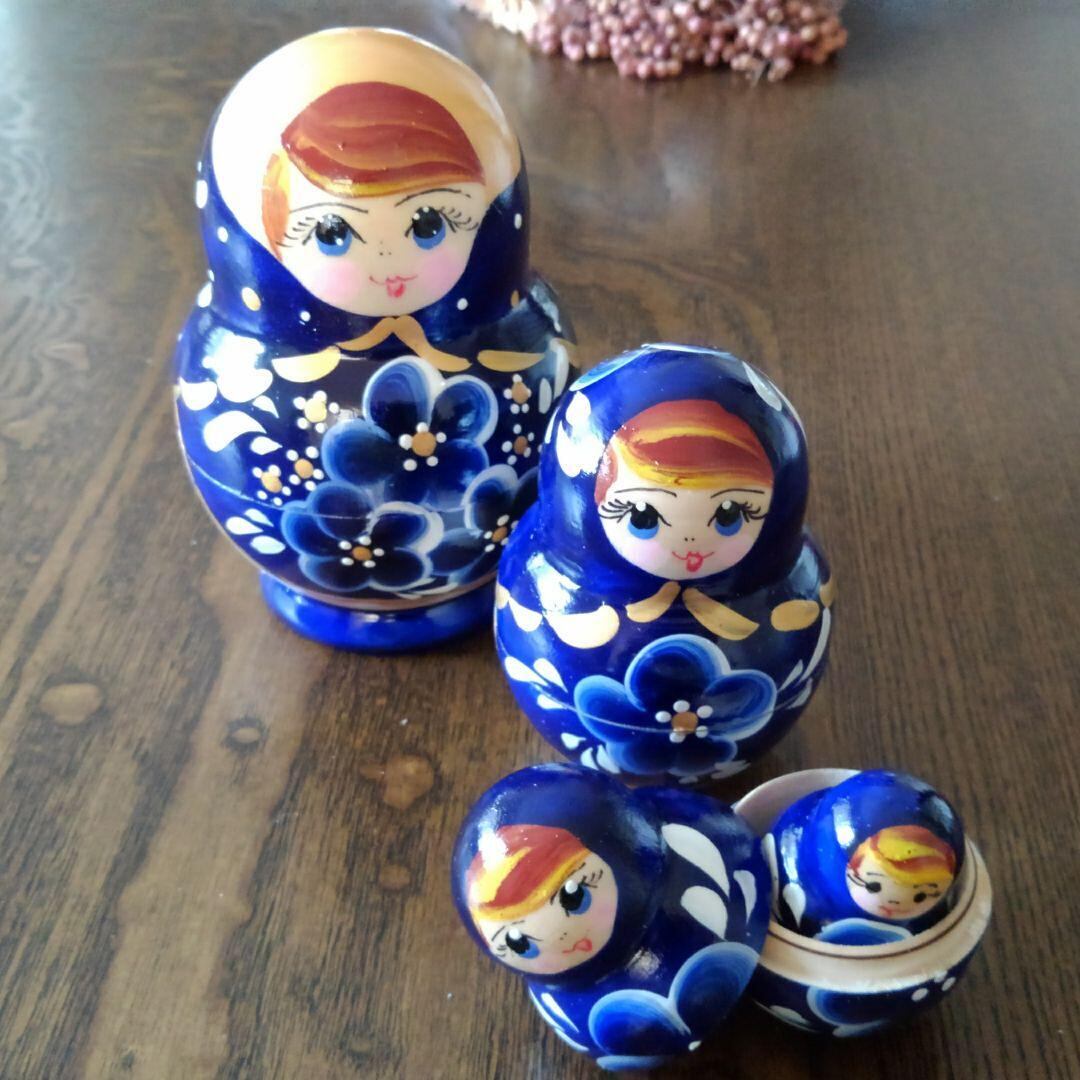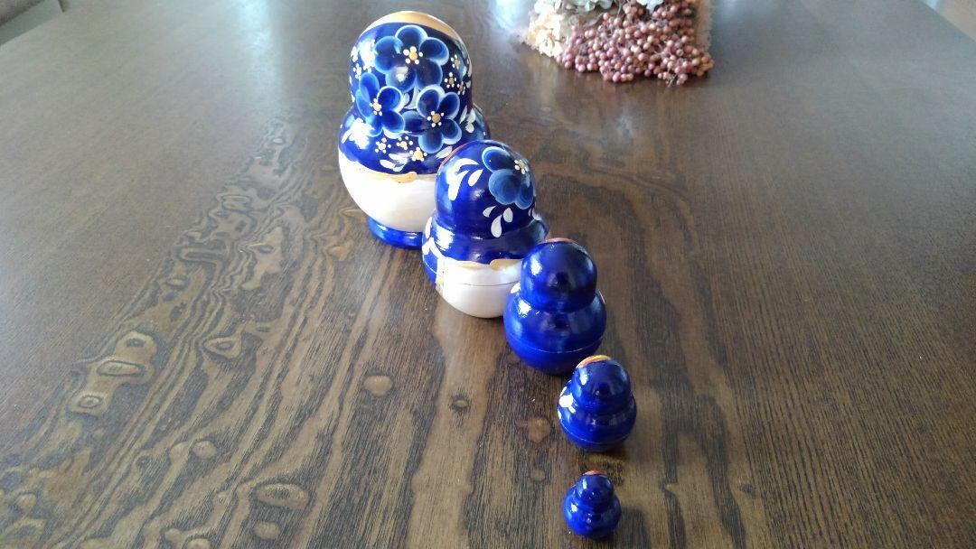 ロシアの伝統陶器グジェリをモチーフにしたマトリョーシカです。トルストゥーシカ(太っちょ)とよばれる種類のマトリョーシカです。