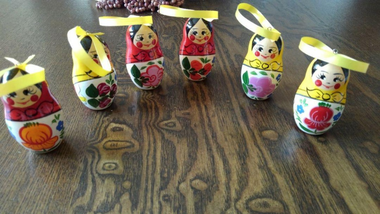 マトリョーシカをモチーフにしたツリーのオーナメントです。ロシアから輸入したハンドメイドの木製工芸品です。1個あたり約15gで、下の方に重しの感覚があり、ツリーや観葉植物の枝がちょうど良いくらいにしなります。セミョーノフと呼ばれるマトリョーシカの中でも歴史の古い種類をモチーフにした絵柄です。