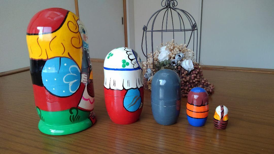 マトリョーシカは新品であっても間近で眺めると絵柄のハネや絵具のはがれ、また、本体内部の木のシミ等がある場合がございます。(インテリアとして普通の距離から眺める分には問題ありません)。