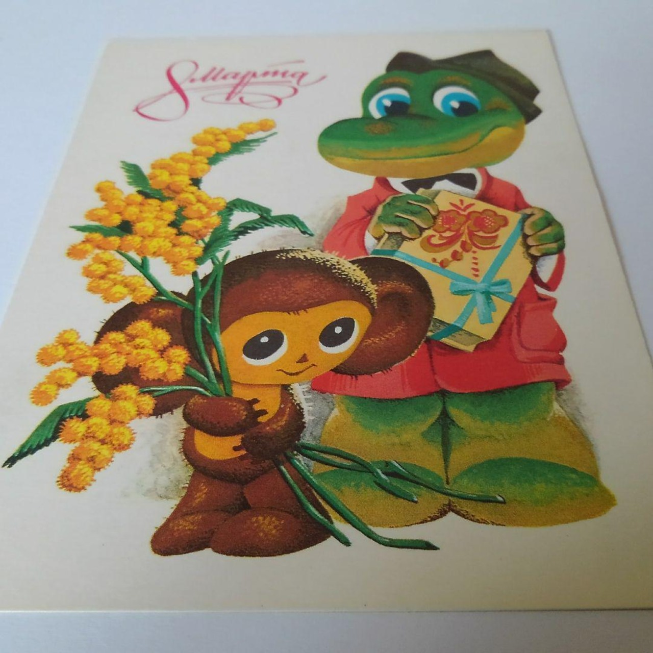 ソ連アニメのヴィンテージ絵葉書です。チェブラーシカとゲーナが描かれています。