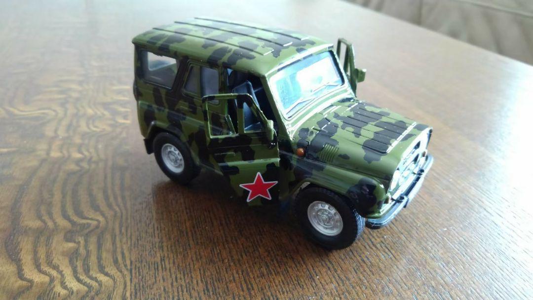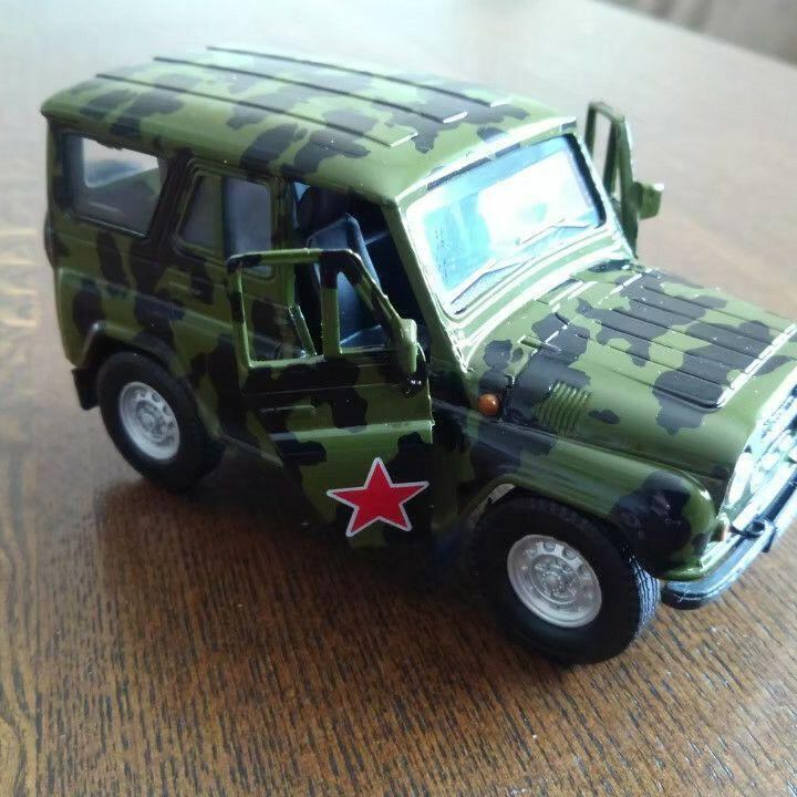 Uaz(ワズ)社のハンターという車種です。迷彩色、陸軍の赤星シンボルがついています。