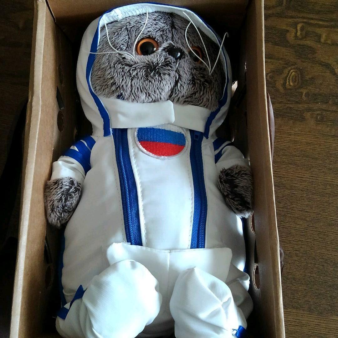 日本で人気を博しているロシアのブディーバーサ社の猫のぬいぐるみ「バーシック」です。ロシアの宇宙飛行士をモチーフにしております。