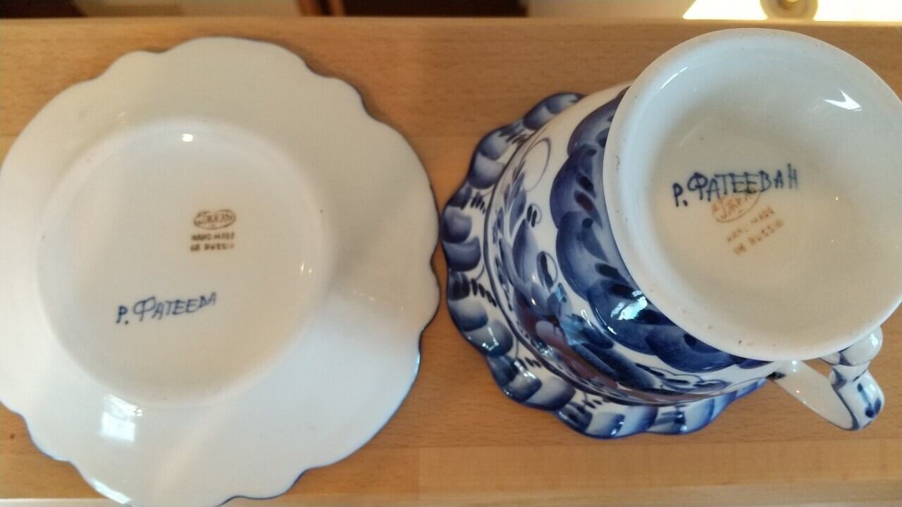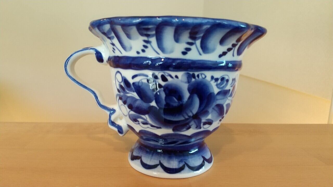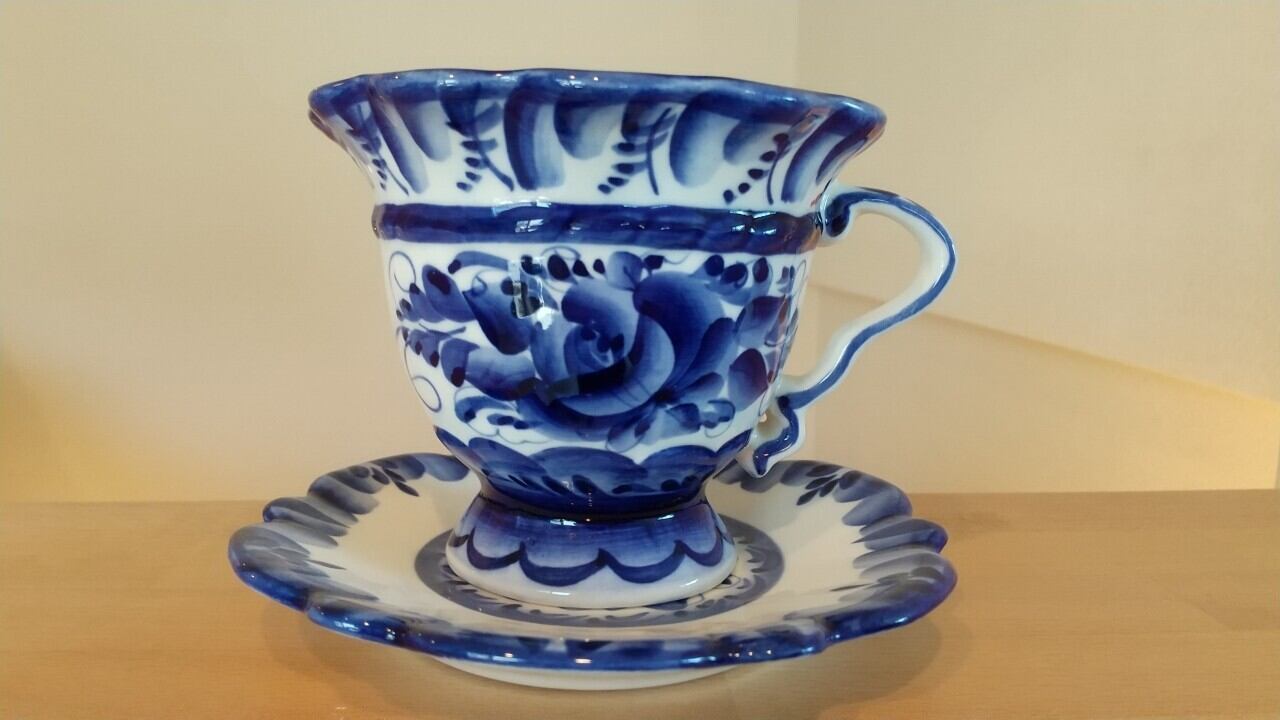 ◆商品説明:ロシアの伝統陶器、グジェリ焼です。ティーカップで、ソーサーつきです。グジェリ焼きのティーカップはコーヒーの色にとっても似合います。ティータイムにいかがでしょうか?