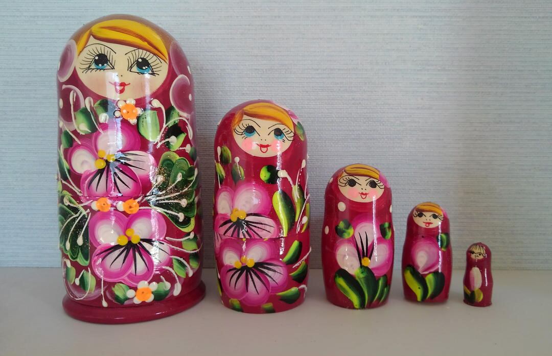 マトリョーシカは新品であっても間近で眺めると絵柄のハネや絵具のはがれ、また、本体内部の木のシミ、ささくれ等がある場合がございます。(インテリアとして普通の距離から眺める分には問題ありません)。