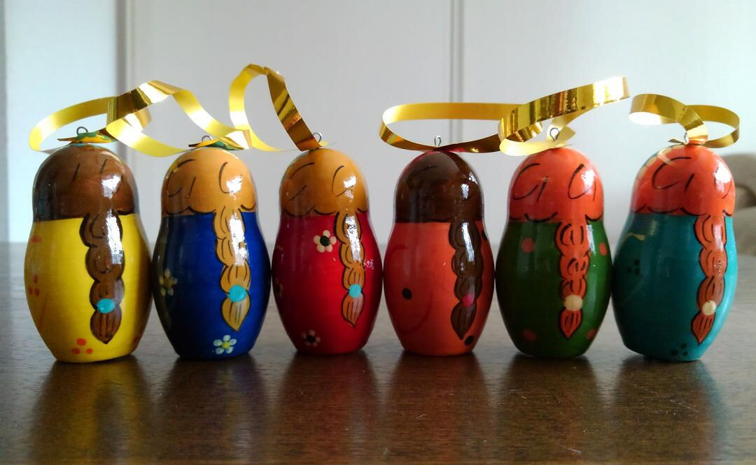 マトリョーシカをモチーフにしたツリーのオーナメントです。ロシアから輸入したハンドメイドの木製工芸品です。1個あたり約15gで、下の方に重しの感覚があり、ツリーや観葉植物の枝がちょうど良いくらいにしなります。ロシアの農村の営為をモチーフにした物語系マトリョーシカです。