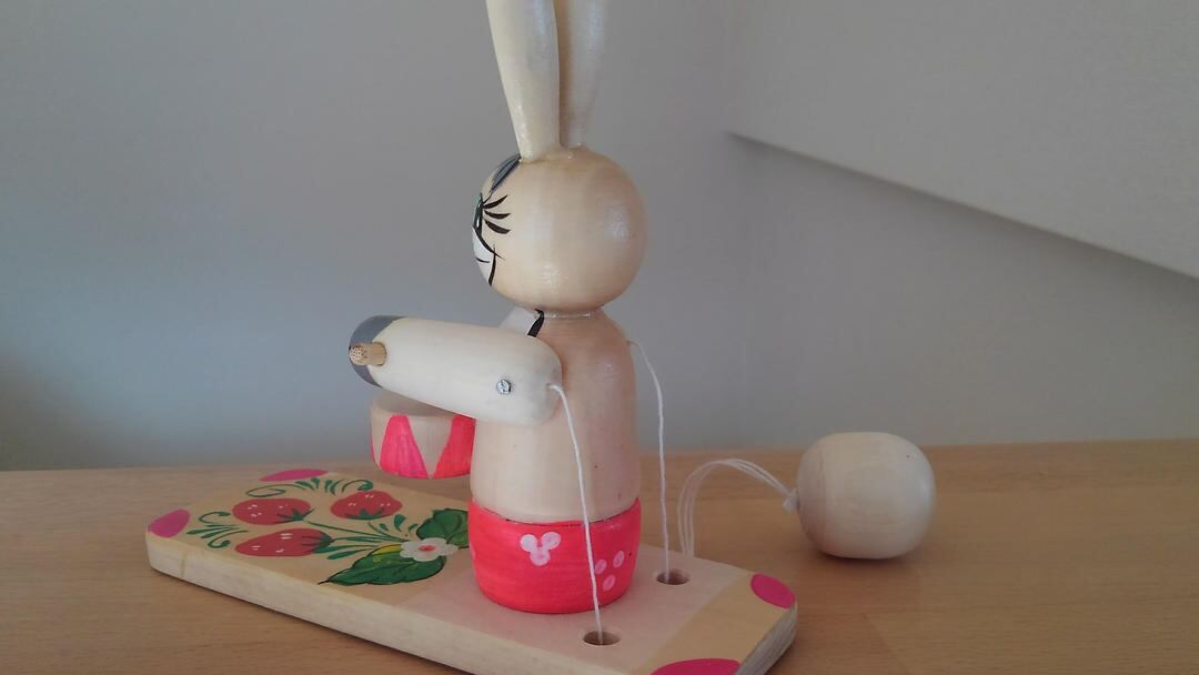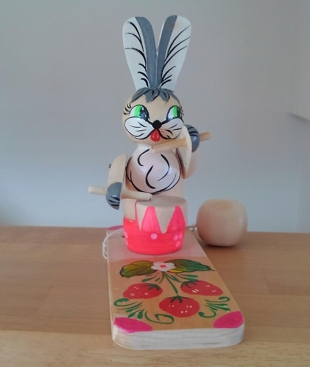 ◆商品説明:ロシアの木製マリオネットです。後ろの紐についている玉を振り子のように左右に振ると、ウサギの両手がカタカタと上下に動き、たいこを叩く仕草をします。