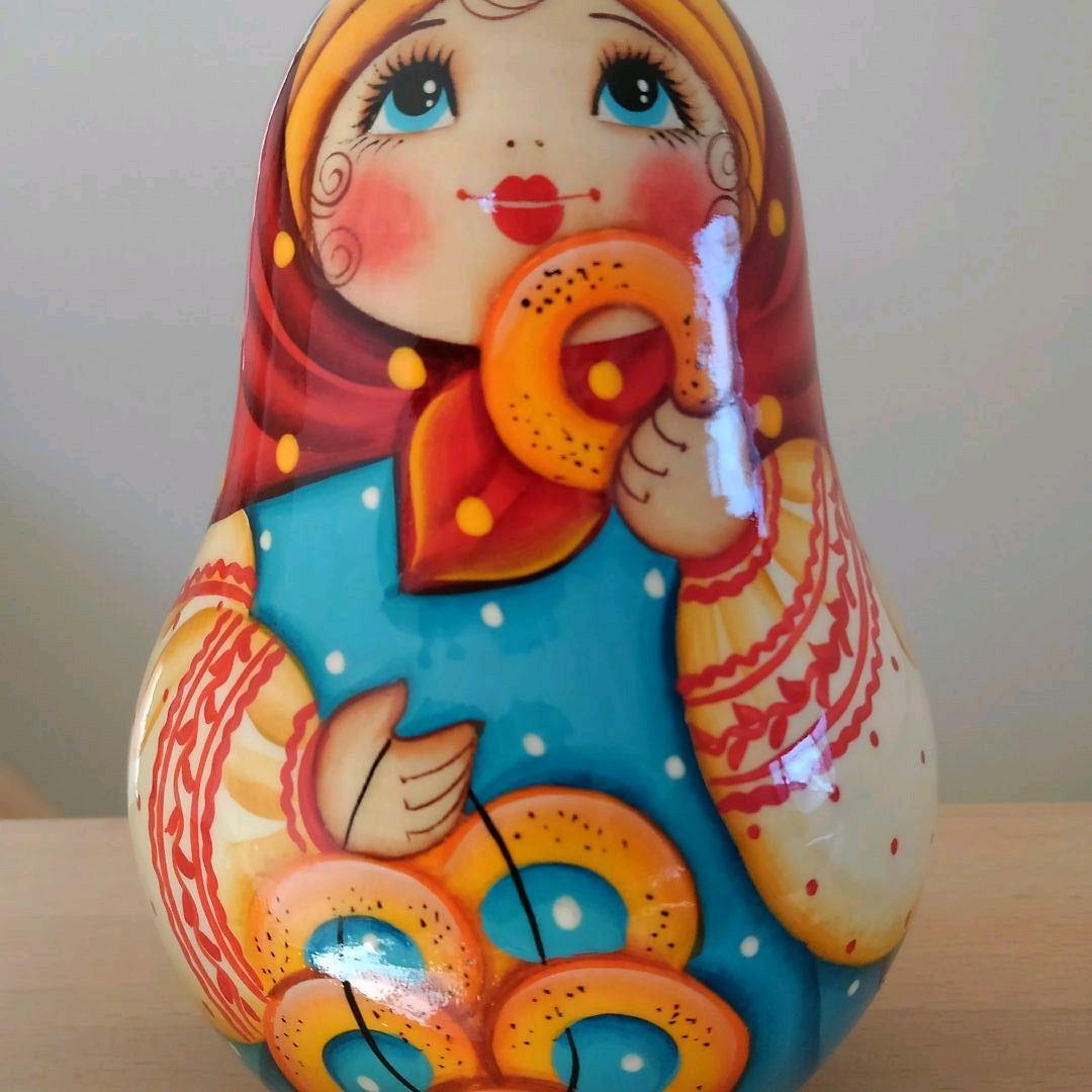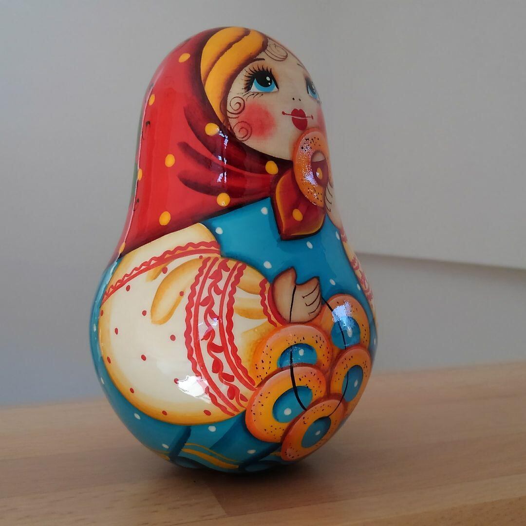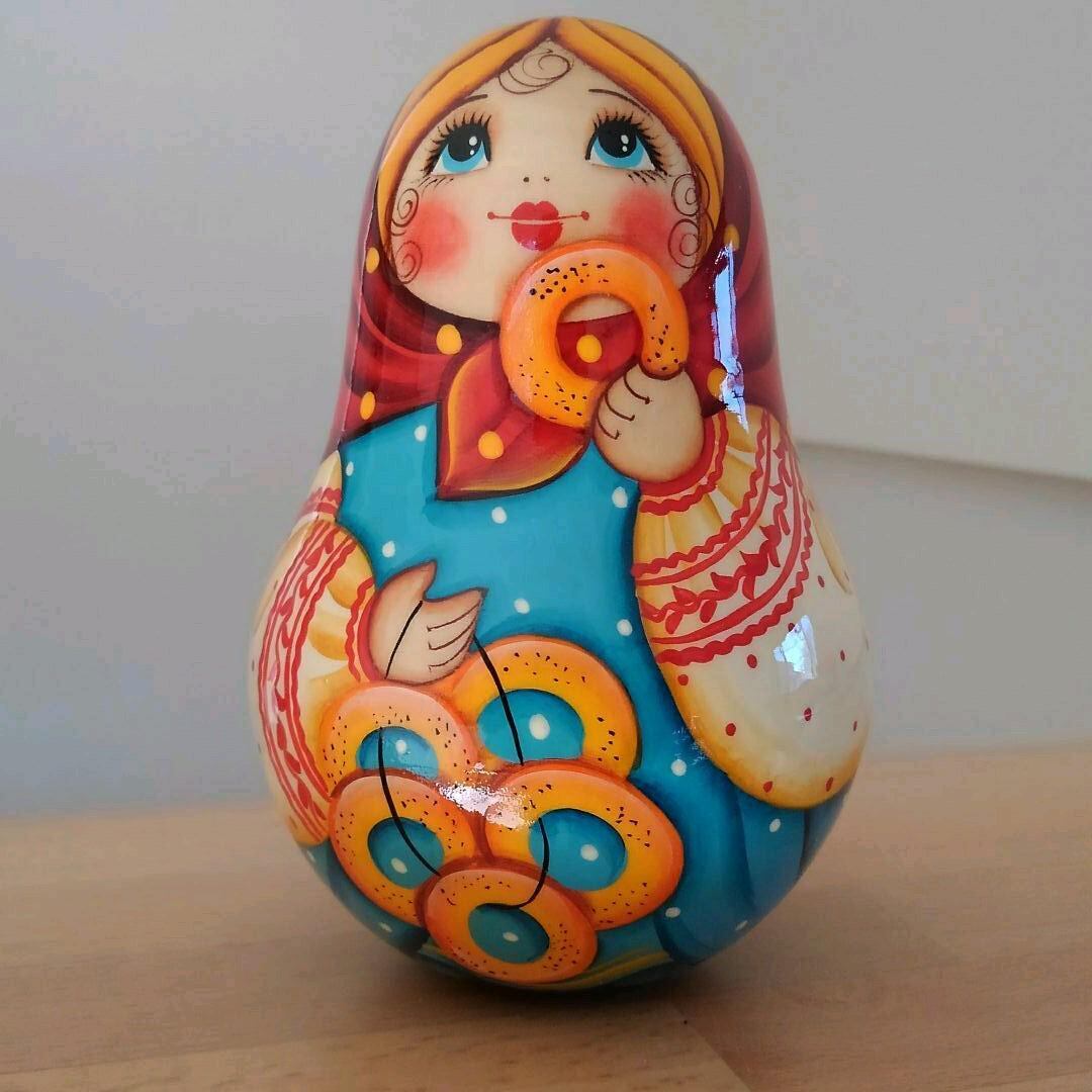 マトリョーシカをモチーフにした起き上がりこぼしです。ロシア伝統のバランカ(ベーグル)を持っている農村の女の子です。