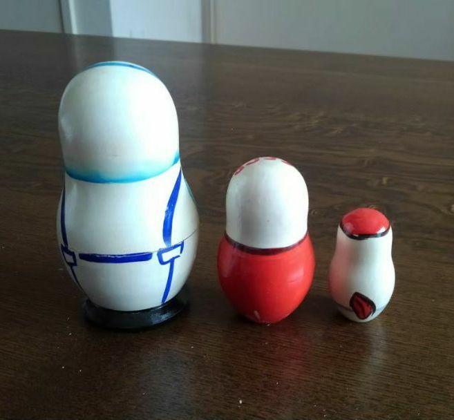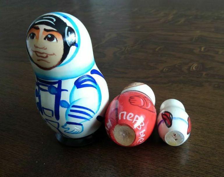 人類初の宇宙飛行士ガガーリンをモチーフにしたマトリョーシカです。"Мы первые"「私たちが初めてだ!」とソビエトが誇る名言が書かれています。