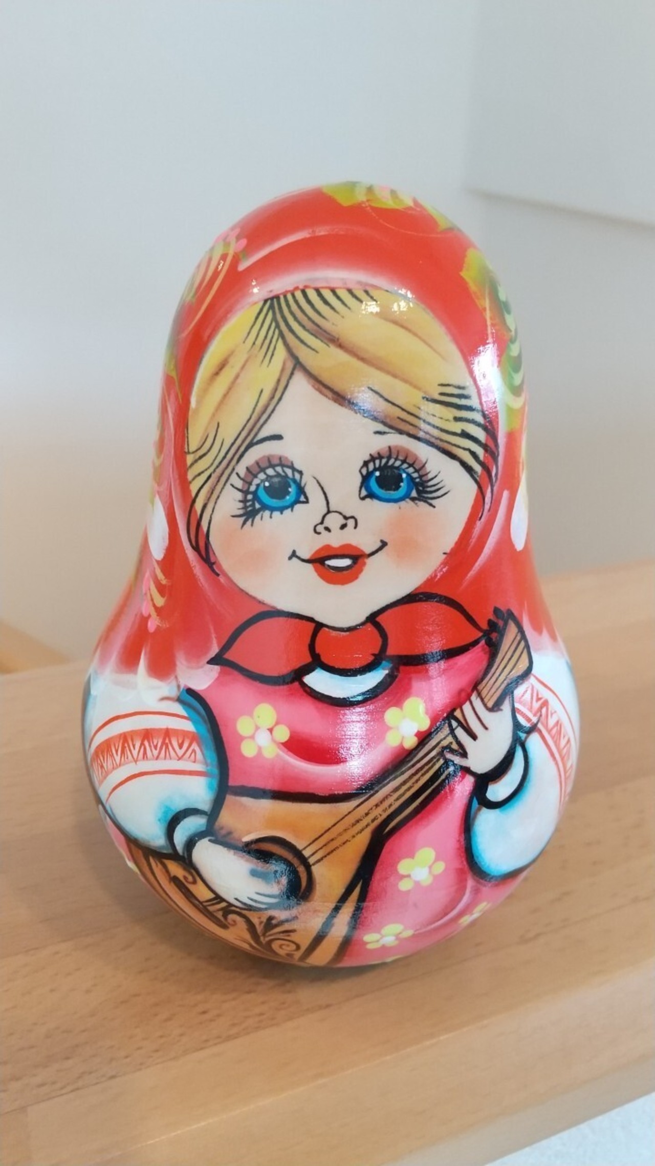 マトリョーシカをモチーフにした起き上がりこぼしです。ロシア伝統のバラライカを持っている農村の女の子です。左右に揺らすと、カランコロンと涼しげな音が鳴り続けます。