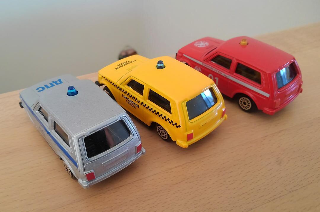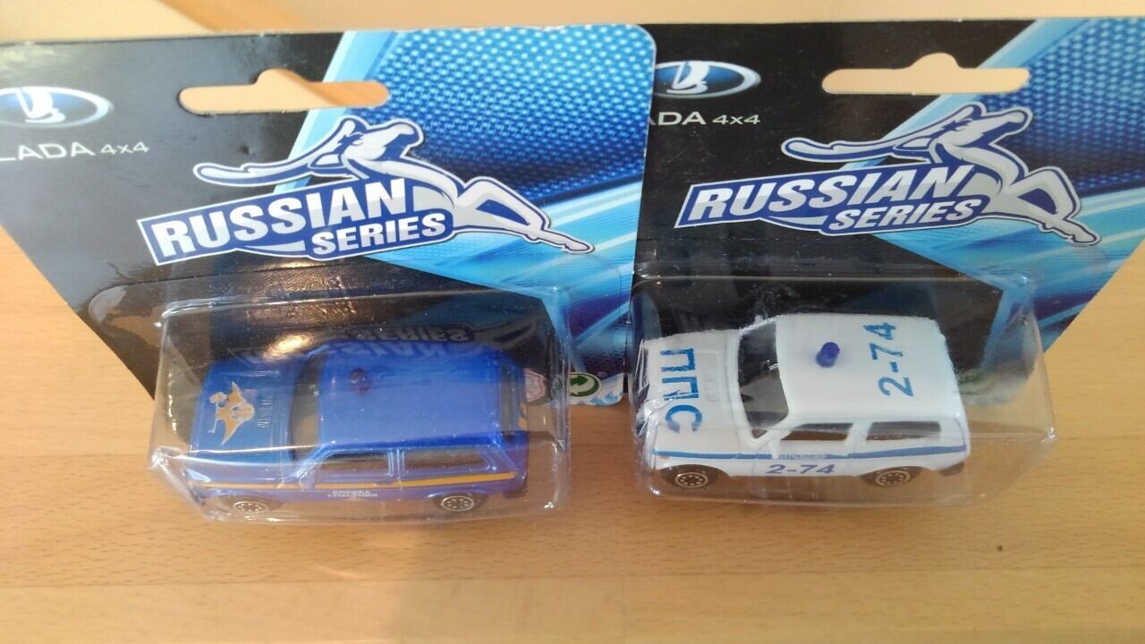 ◆ロシアのミニカー(モデルカー)です。アフトヴァース社製 ラーダ 4x4(NIVA、ニーヴァ)です。青色は災害救助車両、白は道路警察車両です。最後の写真は同じシリーズの車のサンプルです。