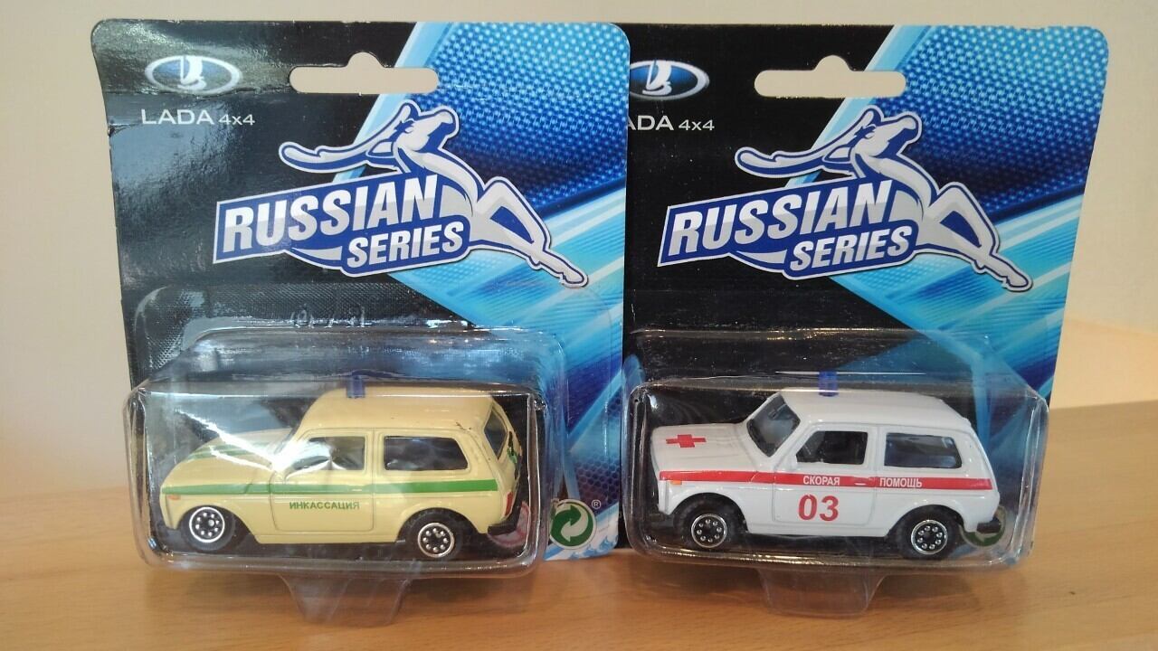 ◆ロシアのミニカー(モデルカー)です。アフトヴァース社製 ラーダ 4x4(NIVA、ニーヴァ)です。クリーム色は現金輸送車両、白は緊急医療車両です。最後の写真は同じシリーズの車のサンプルです。