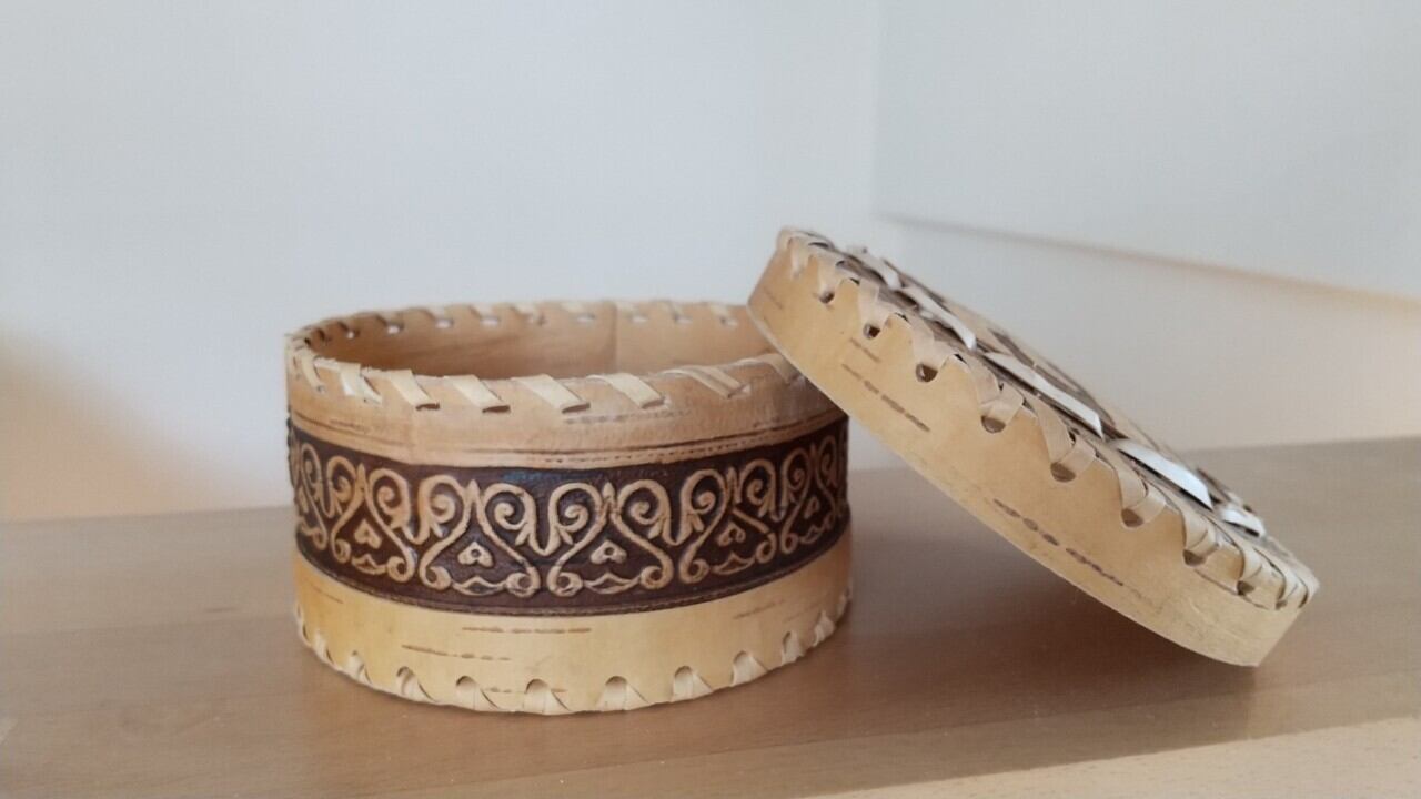 ロシア・北欧の小物入れ、ベレスタです。殺菌作用抜群として有名な白樺の真皮で作られています。子牛と小鳥をモチーフにしています。