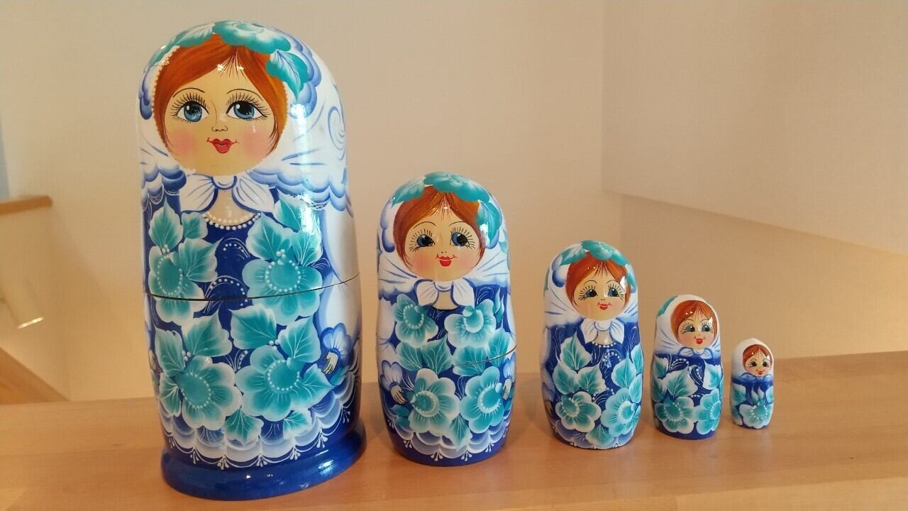北欧ロシアの民芸人形、マトリョーシカ(5ピース)【水色の花】