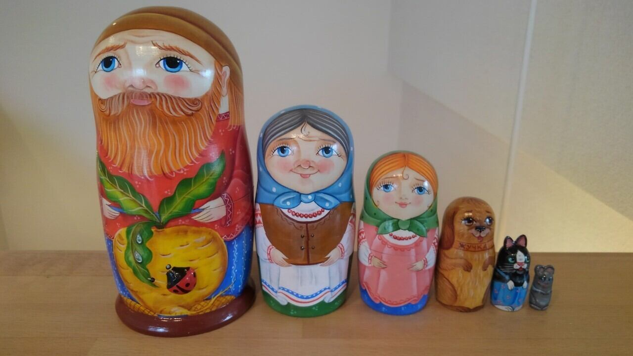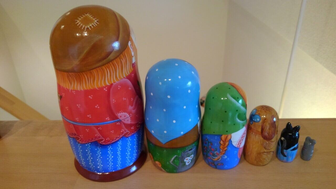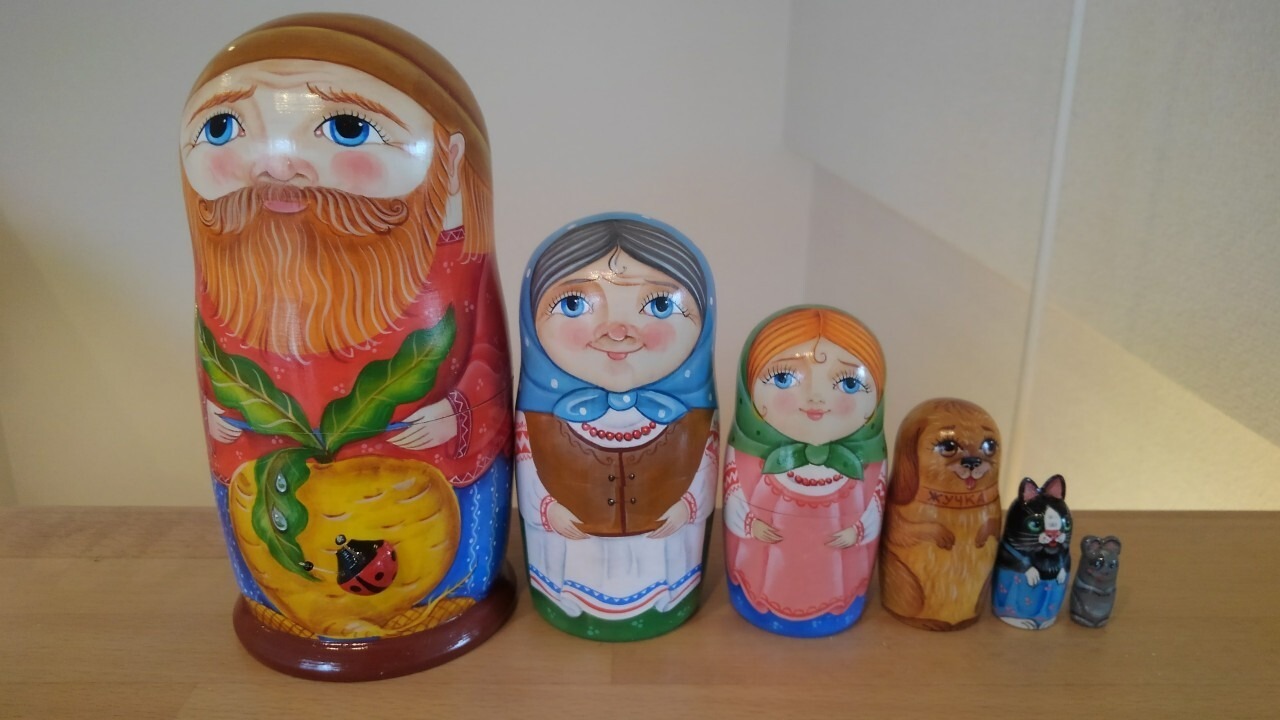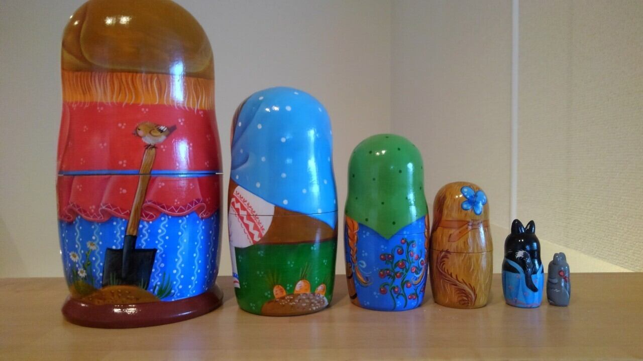 ロシアで有名なオリガ・グセヴァさんという作家から直接譲り受けたマトリョーシカです。ロシア民話の大きなかぶをモチーフにしています。