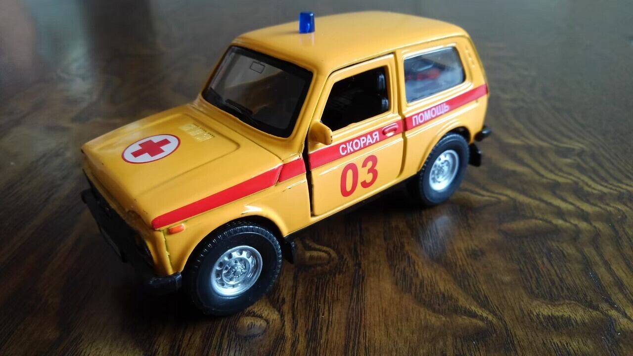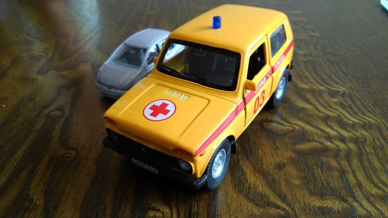 ◆ロシアのミニカー(モデルカー)です。アフトヴァース社製 ラーダ 4x4(NIVA、ニーヴァ)の救急医療車です。トミカの約3倍ほどの大きさです。