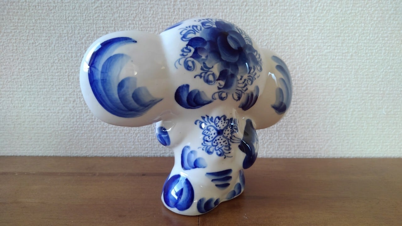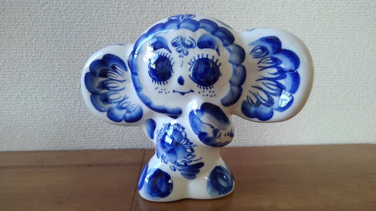 ロシアの伝統工芸陶器、グジェリ焼きです。チェブラーシュカをモチーフにしたデカチェブです。重量感のある大きいグジェリです。