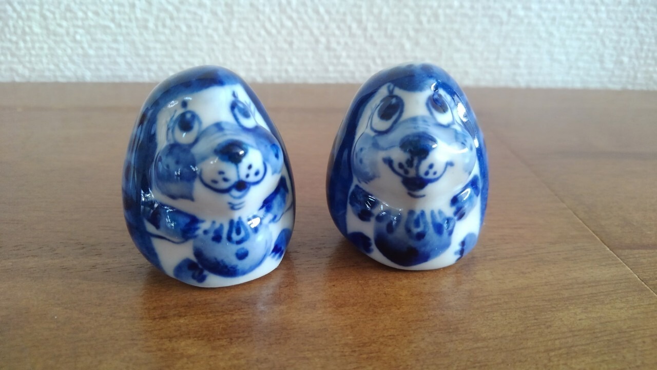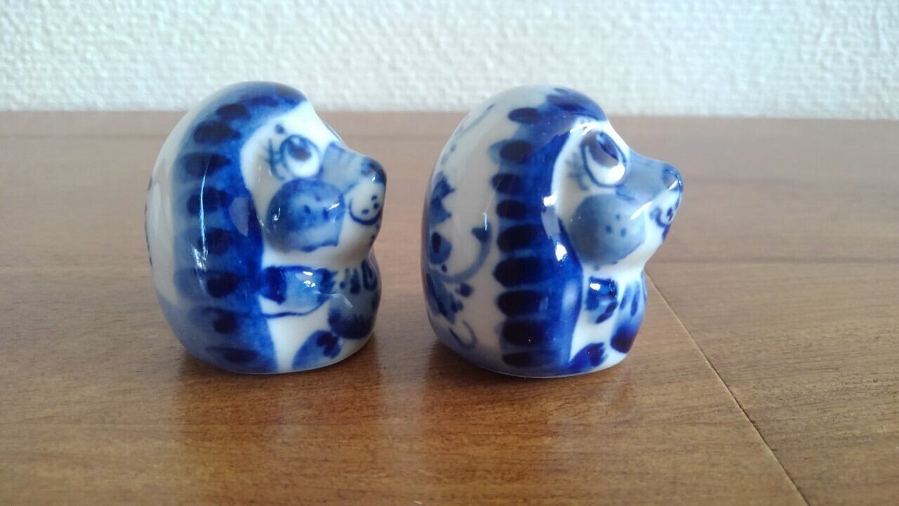 ロシアの伝統陶器、グジェリ焼きです。ハリネズミをモチーフにしています。2体セット・バラ売り不可です。