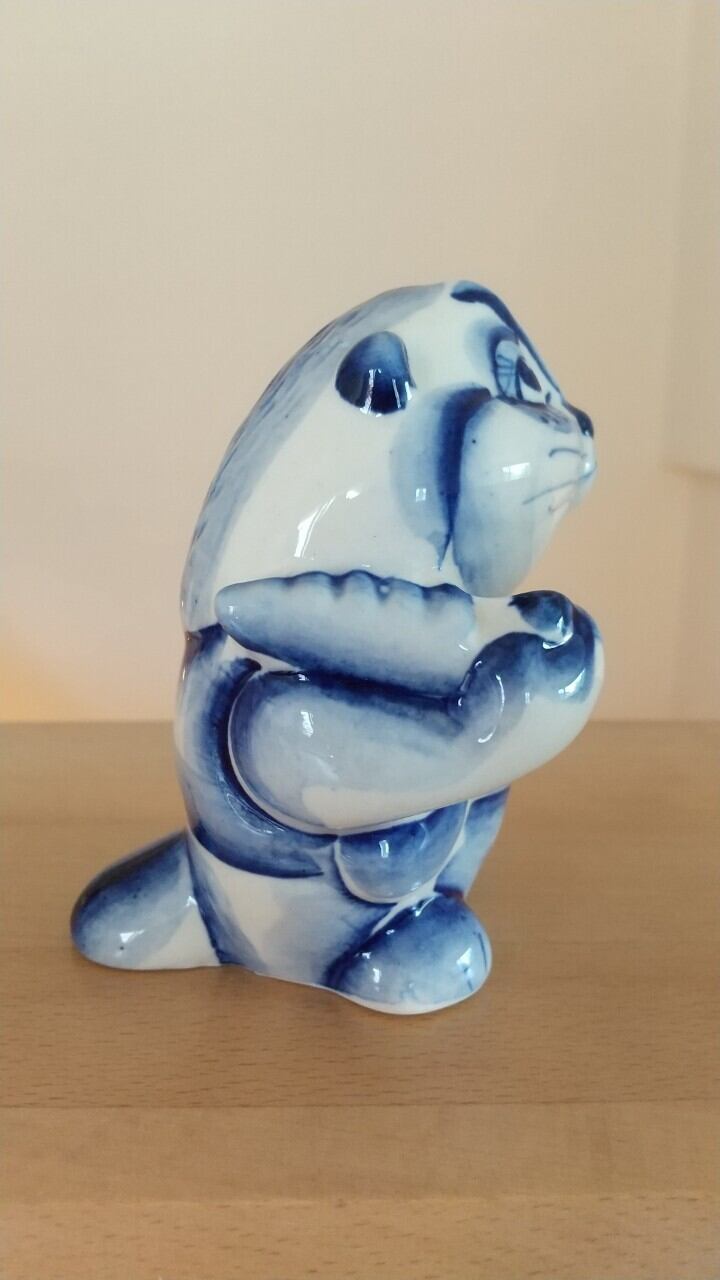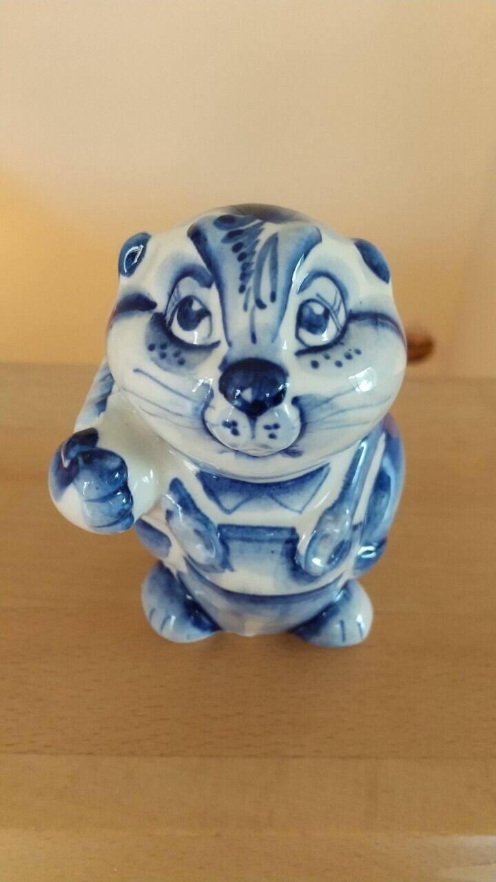 ロシアの伝統陶器、グジェリ焼きです。オーバーオールを着たビーバーをモチーフにしています。