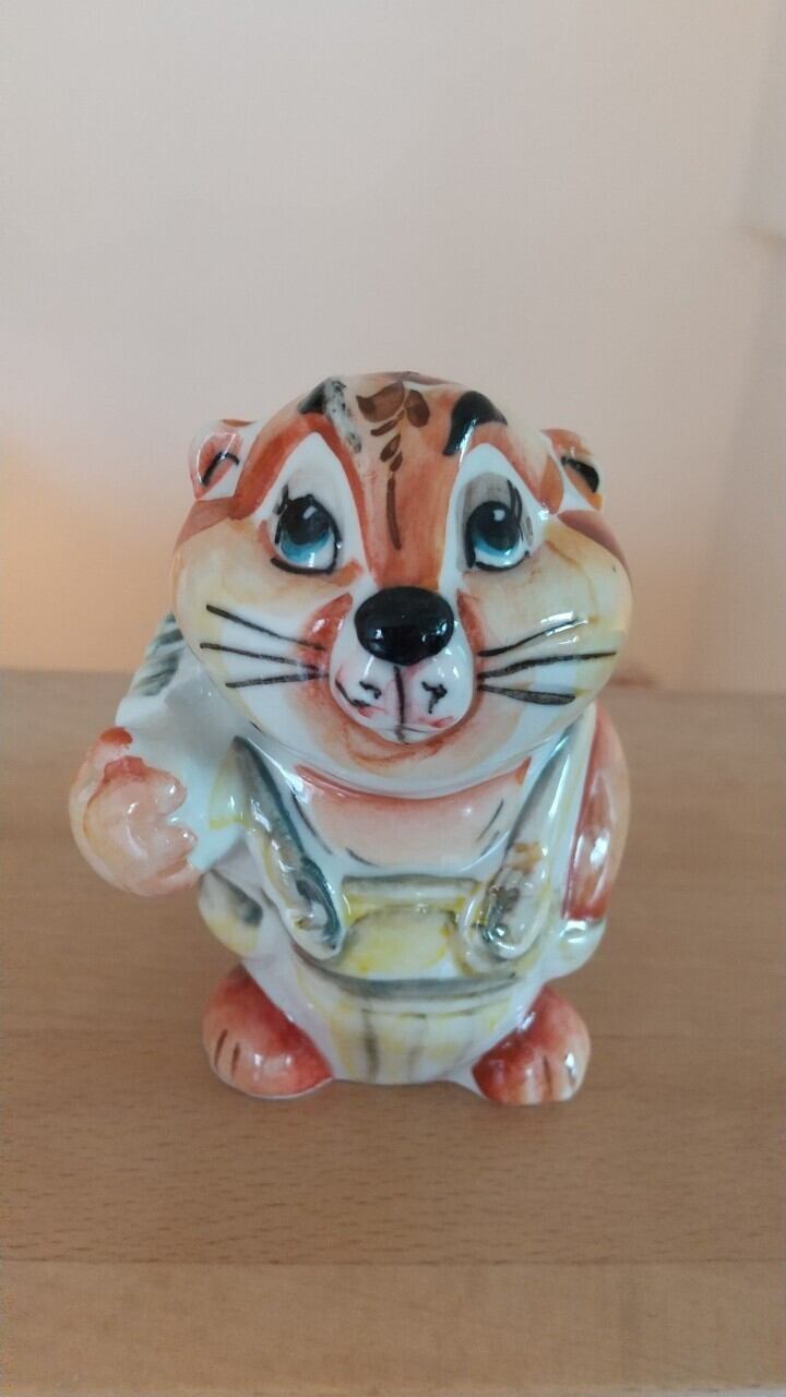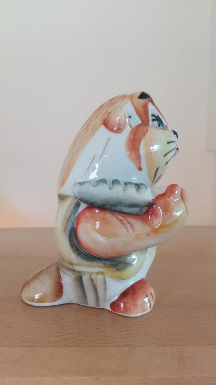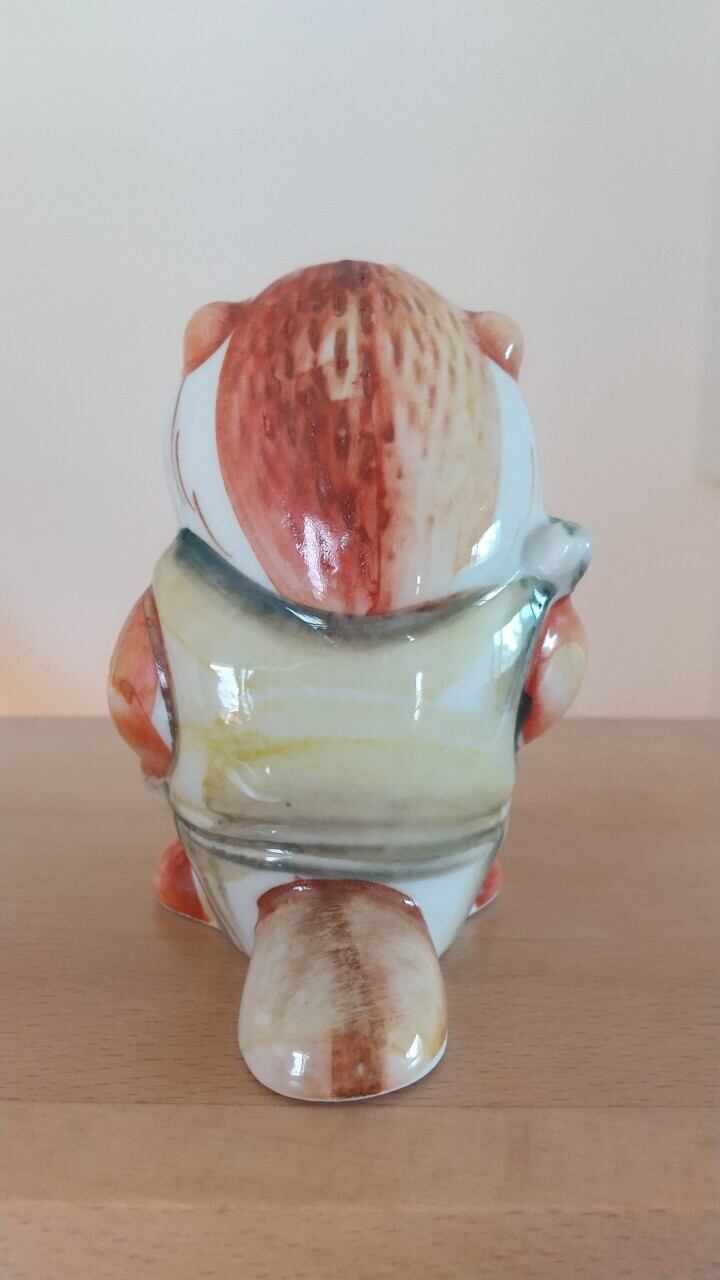 ロシアの伝統陶器、グジェリ焼きです。オーバーオールを着たビーバーをモチーフにしています。