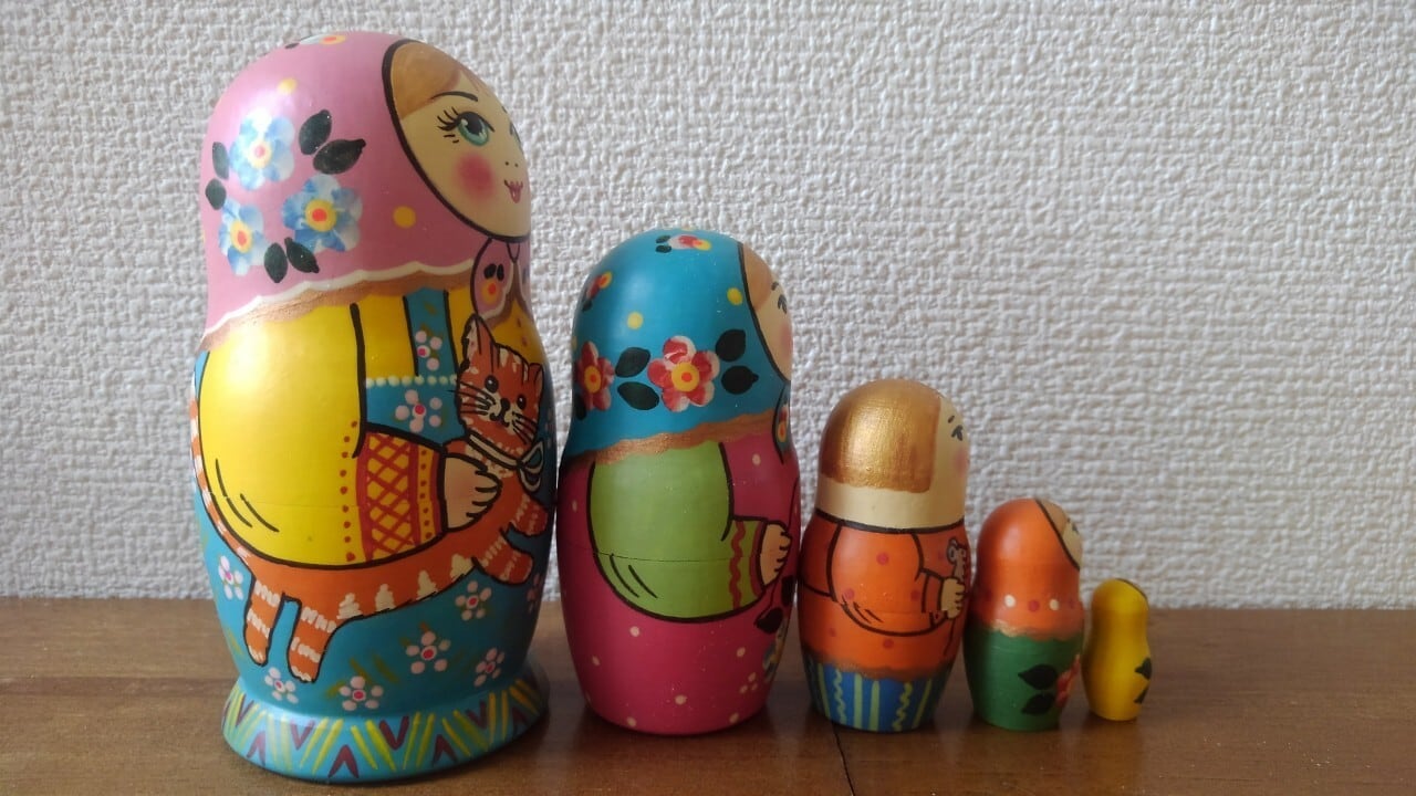ロシアで有名なナジェージダ・リュボーフィ親子という親子作家から直接譲り受けたマトリョーシカです。ネコをモチーフにしています。