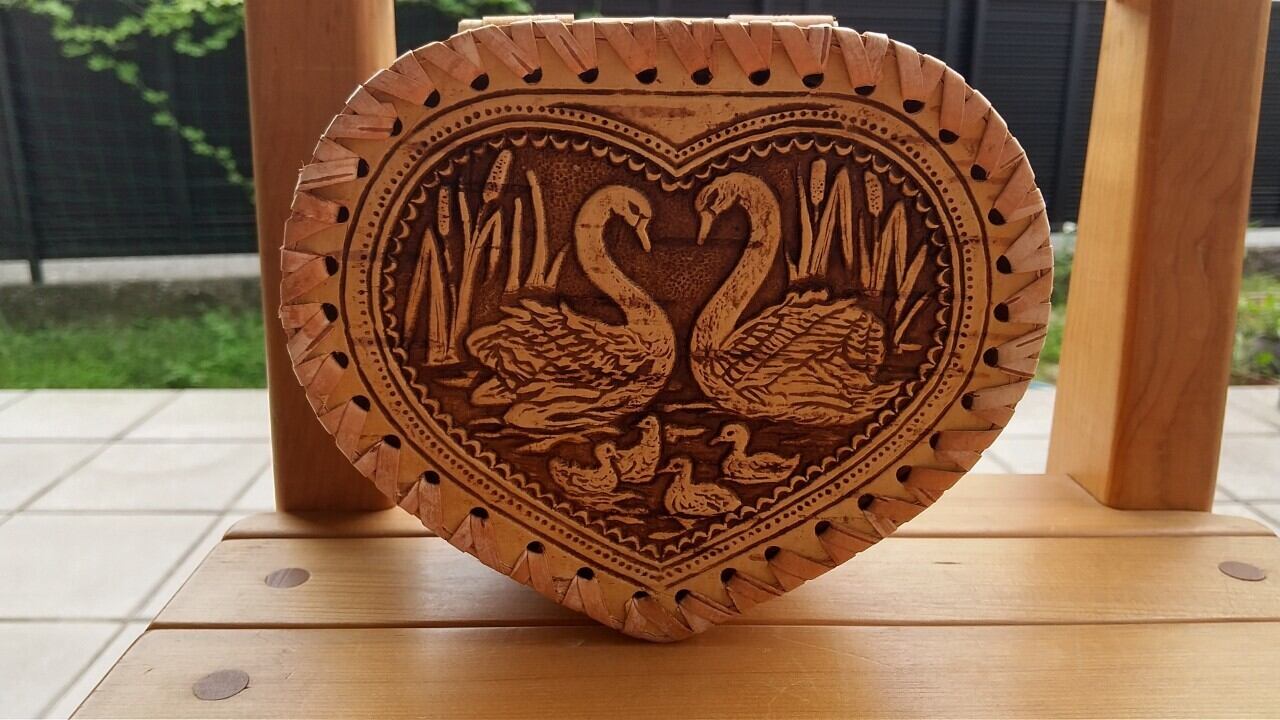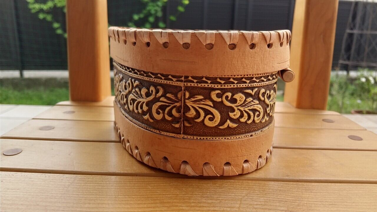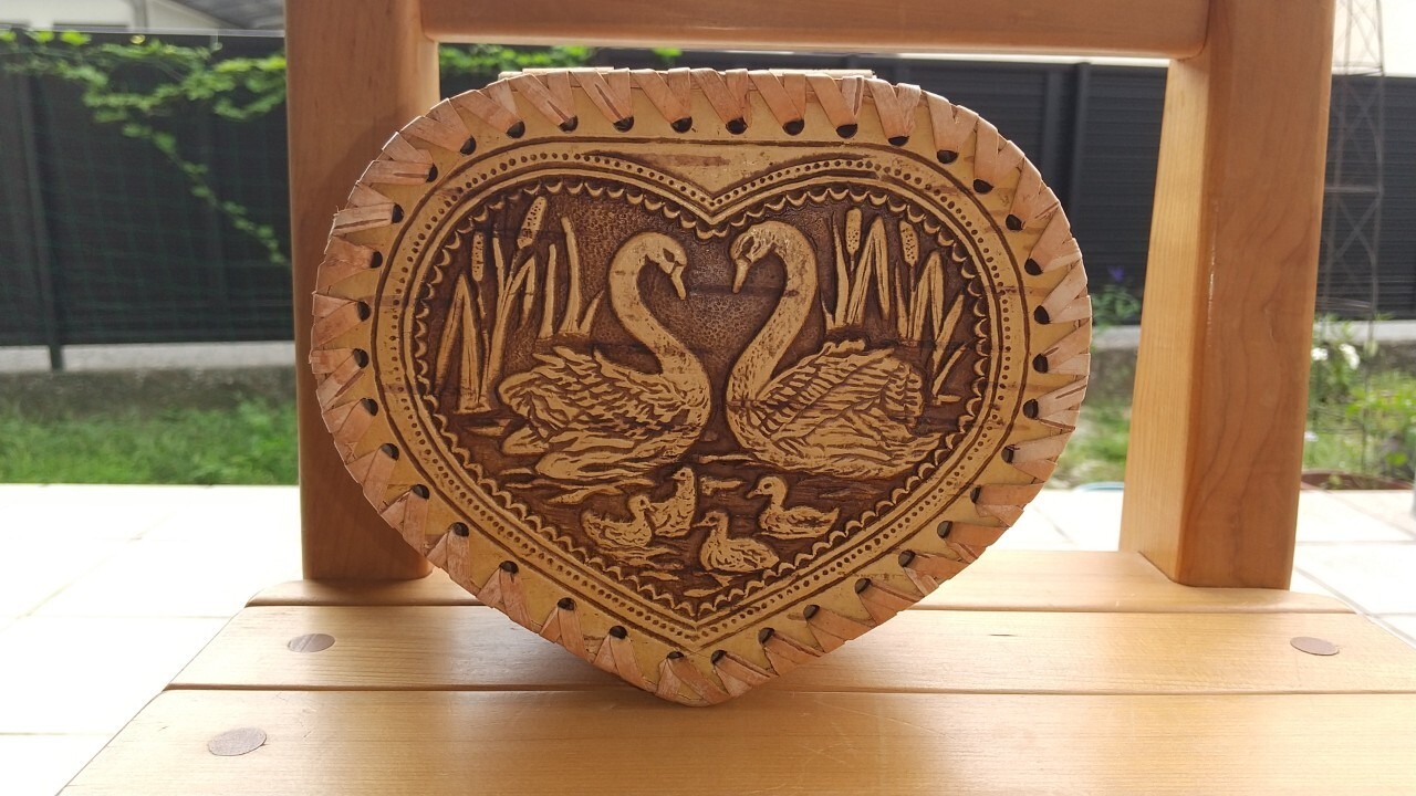 ロシア・北欧の小物入れ、ベレスタです。白樺の真皮で作られている白樺細工です。白鳥をモチーフにしています。ベレスタ職人のハンドメイド作品です。大きめのサイズです。