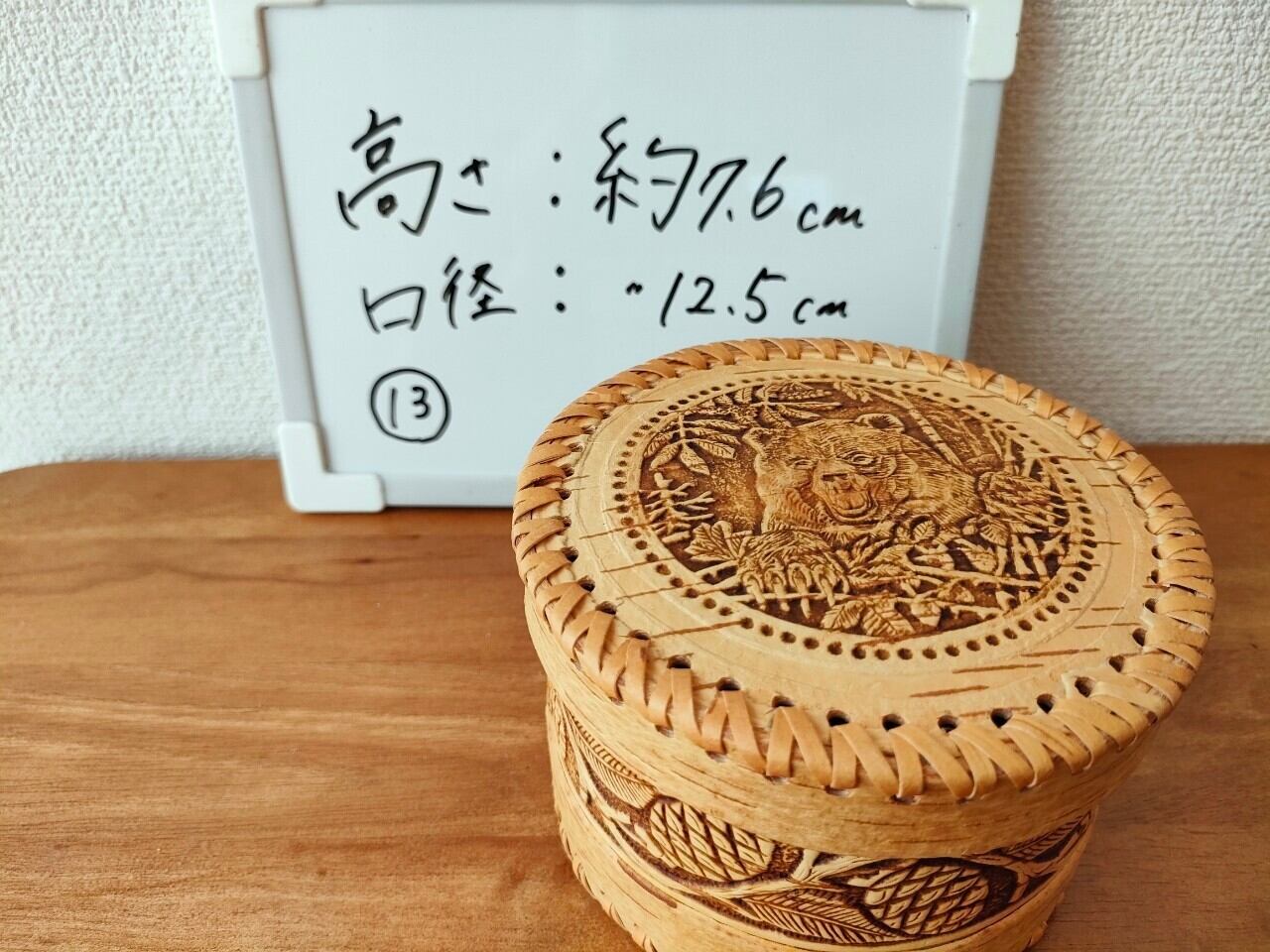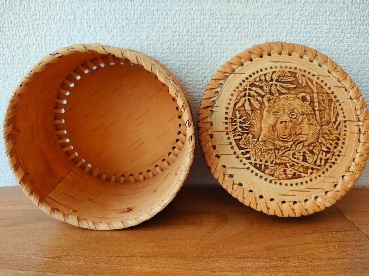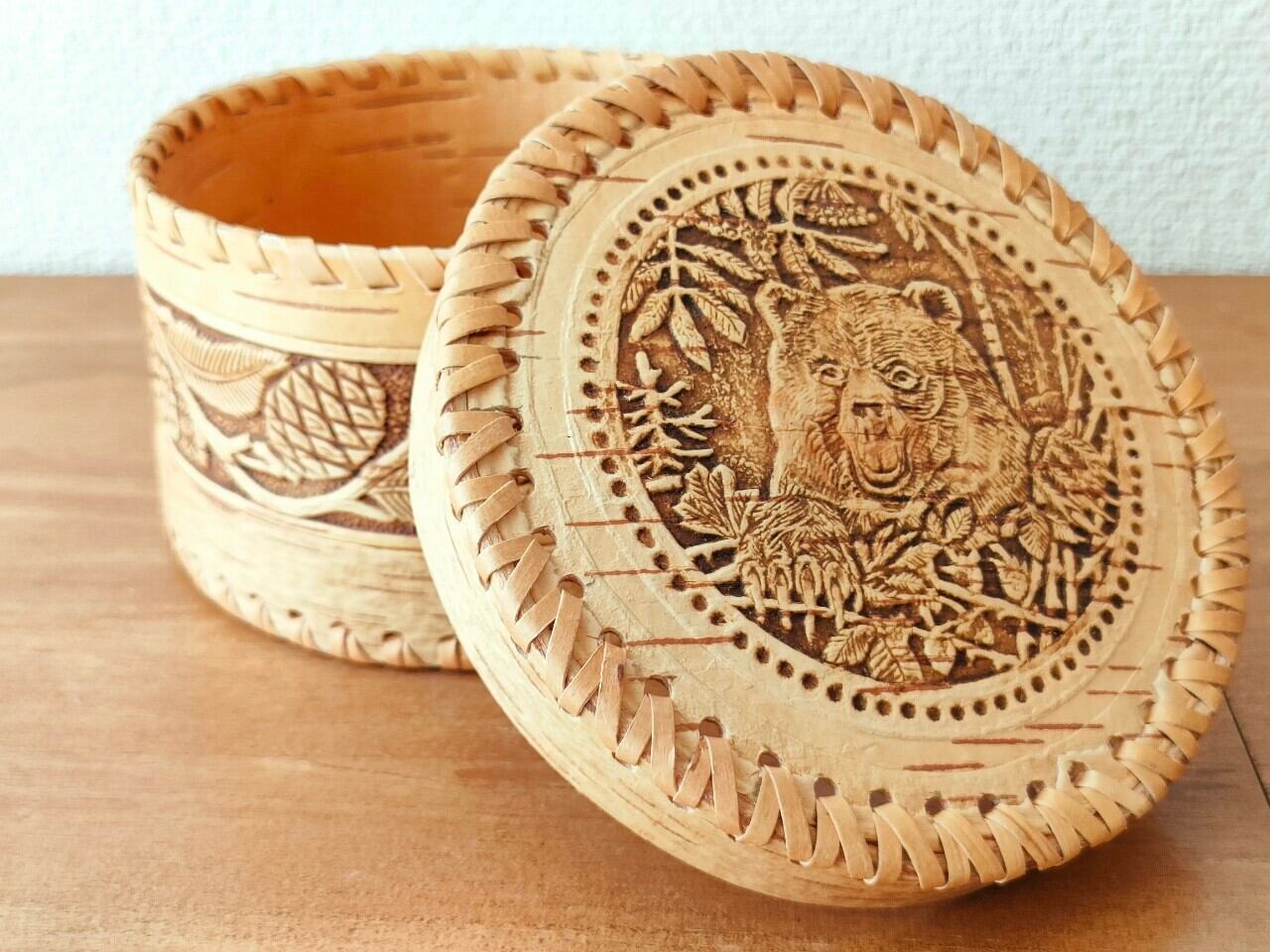 【BE020】北欧ロシア雑貨、(縁編み付き)ベレスタ・白樺の小物入れ【クマ】