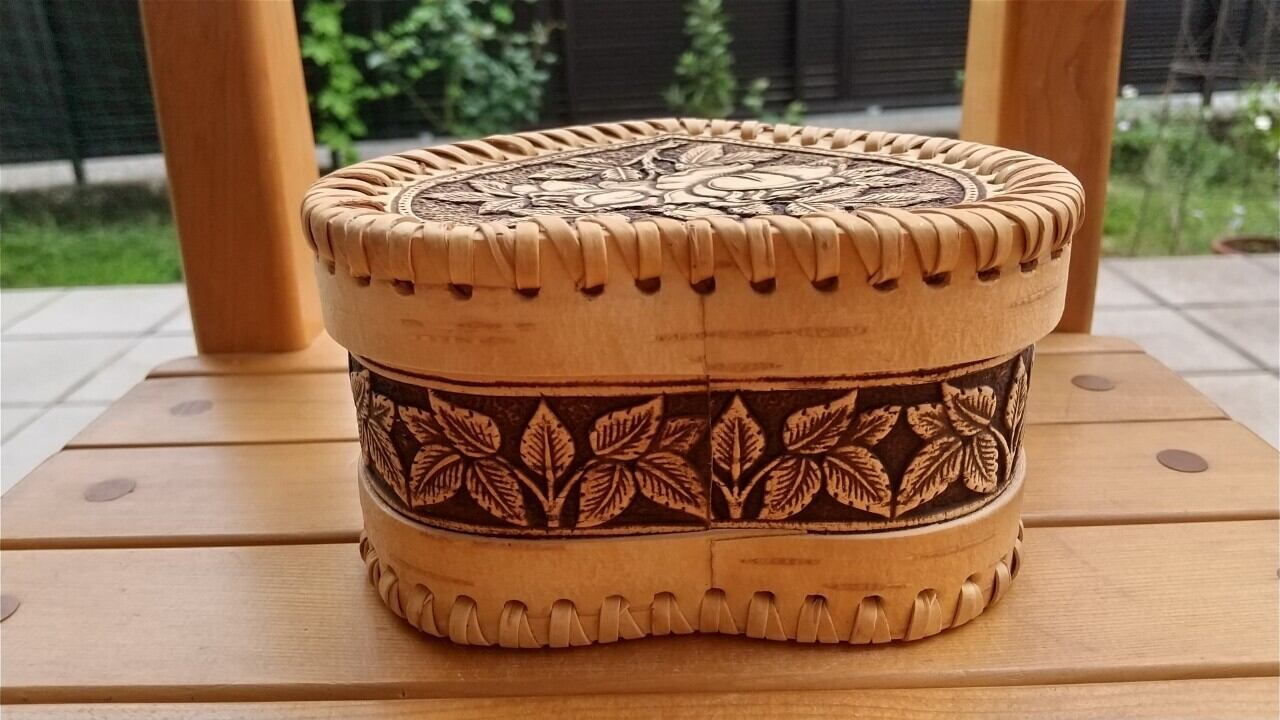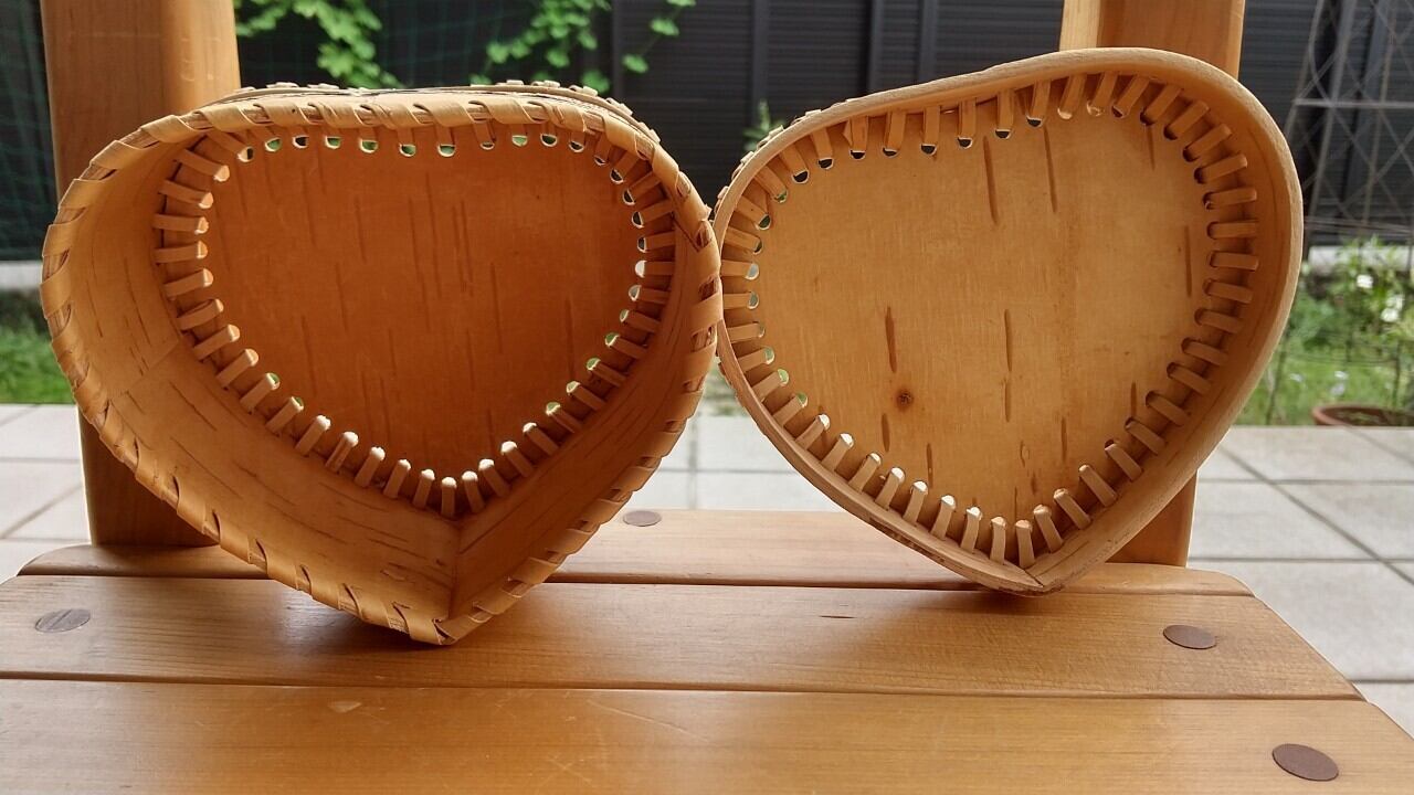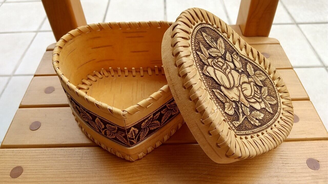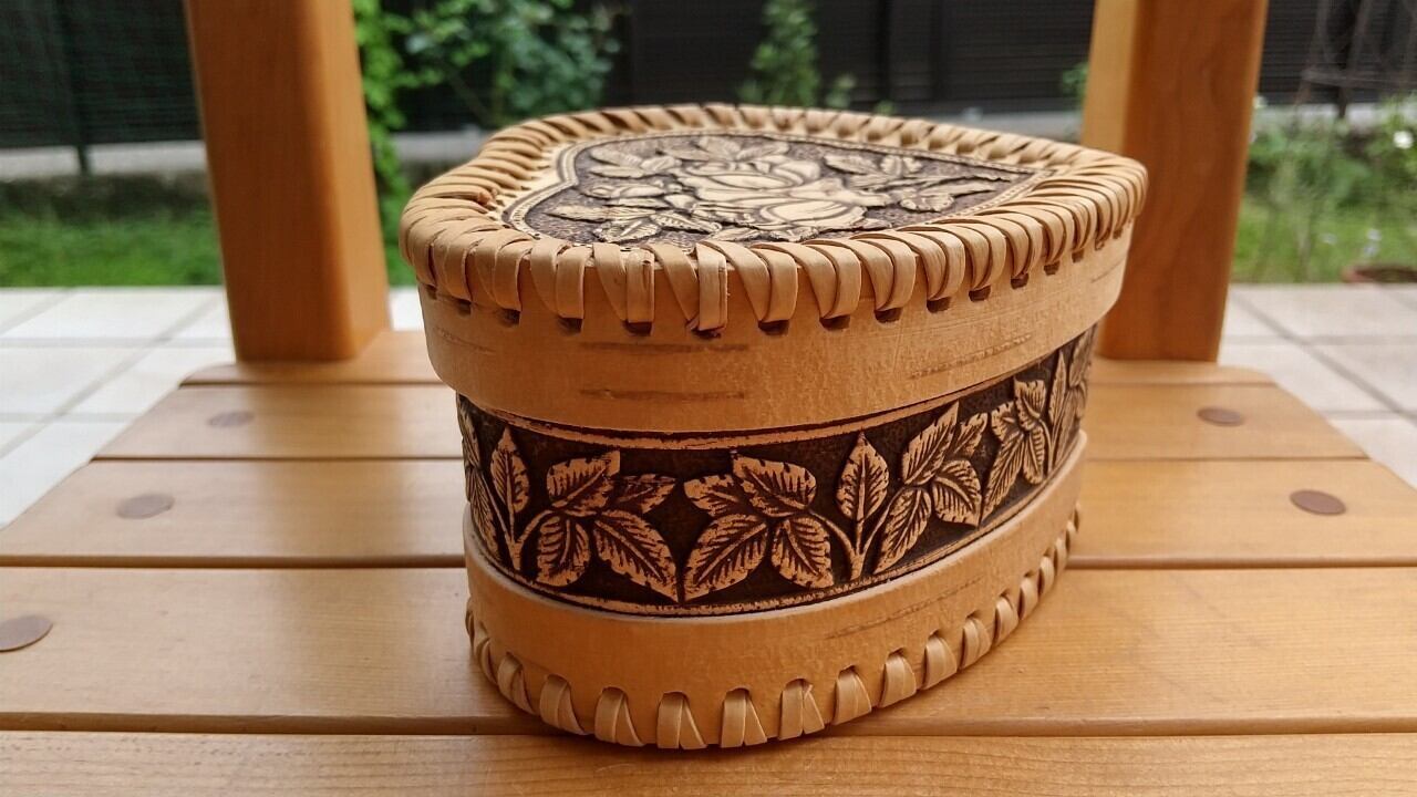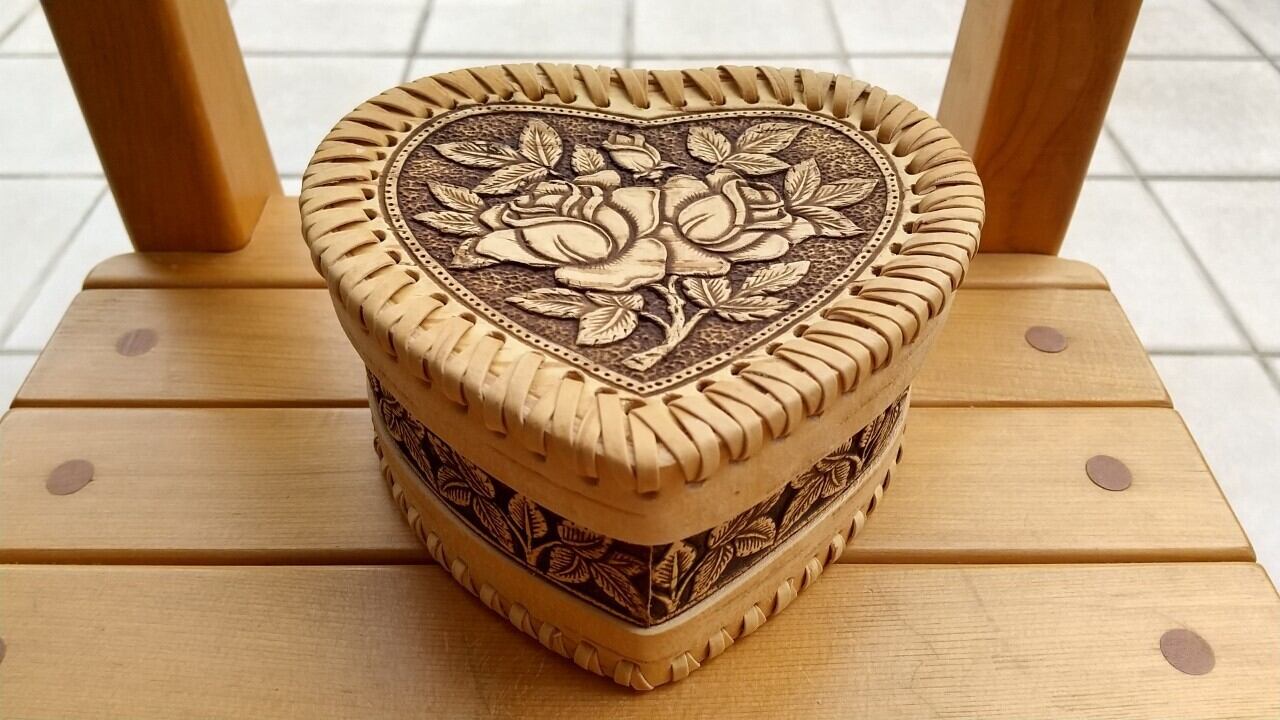 ロシア・北欧の小物入れ、ベレスタです。白樺の真皮で作られている白樺細工です。ハートのバラをモチーフにしています。ベレスタ職人のハンドメイド作品です。