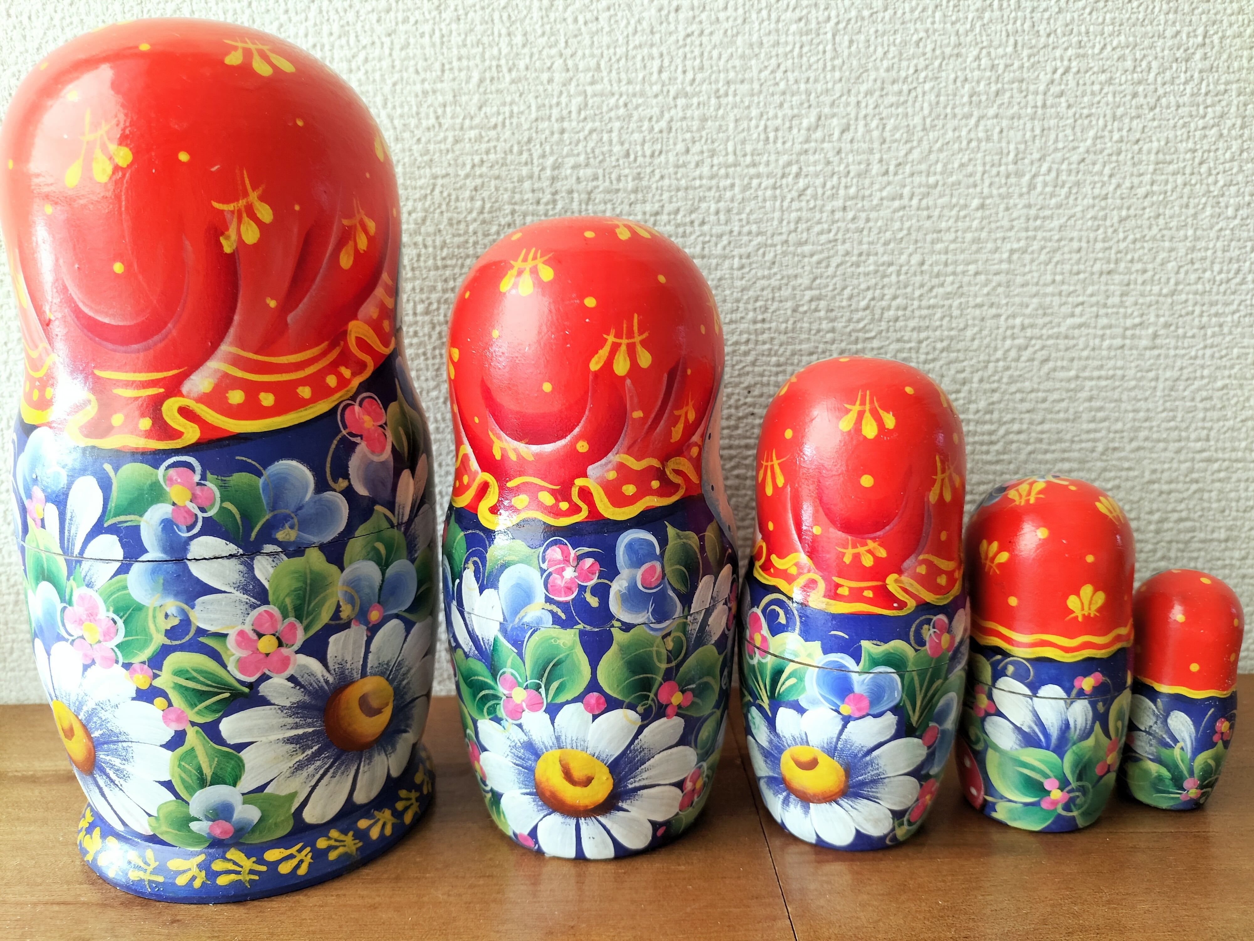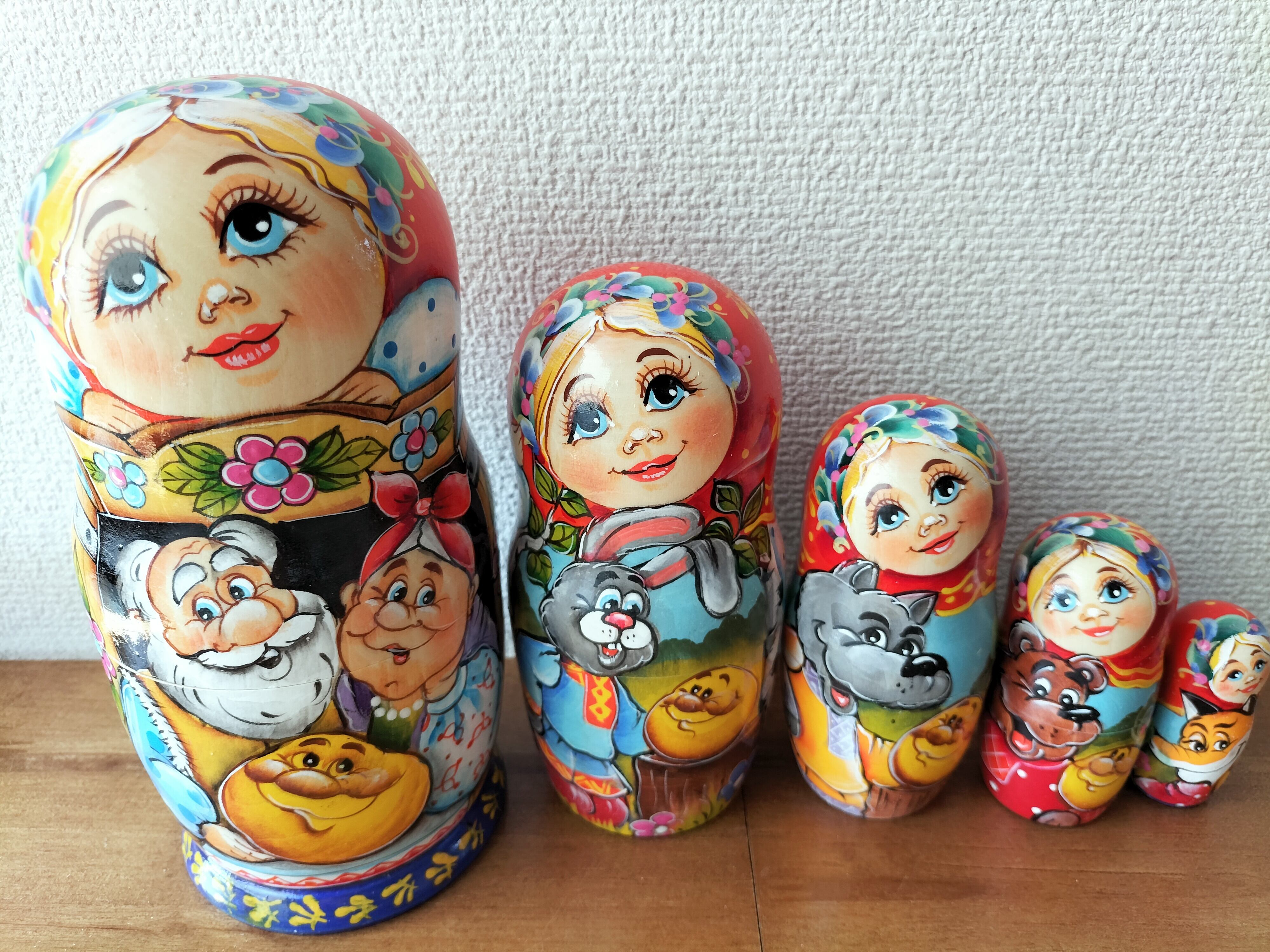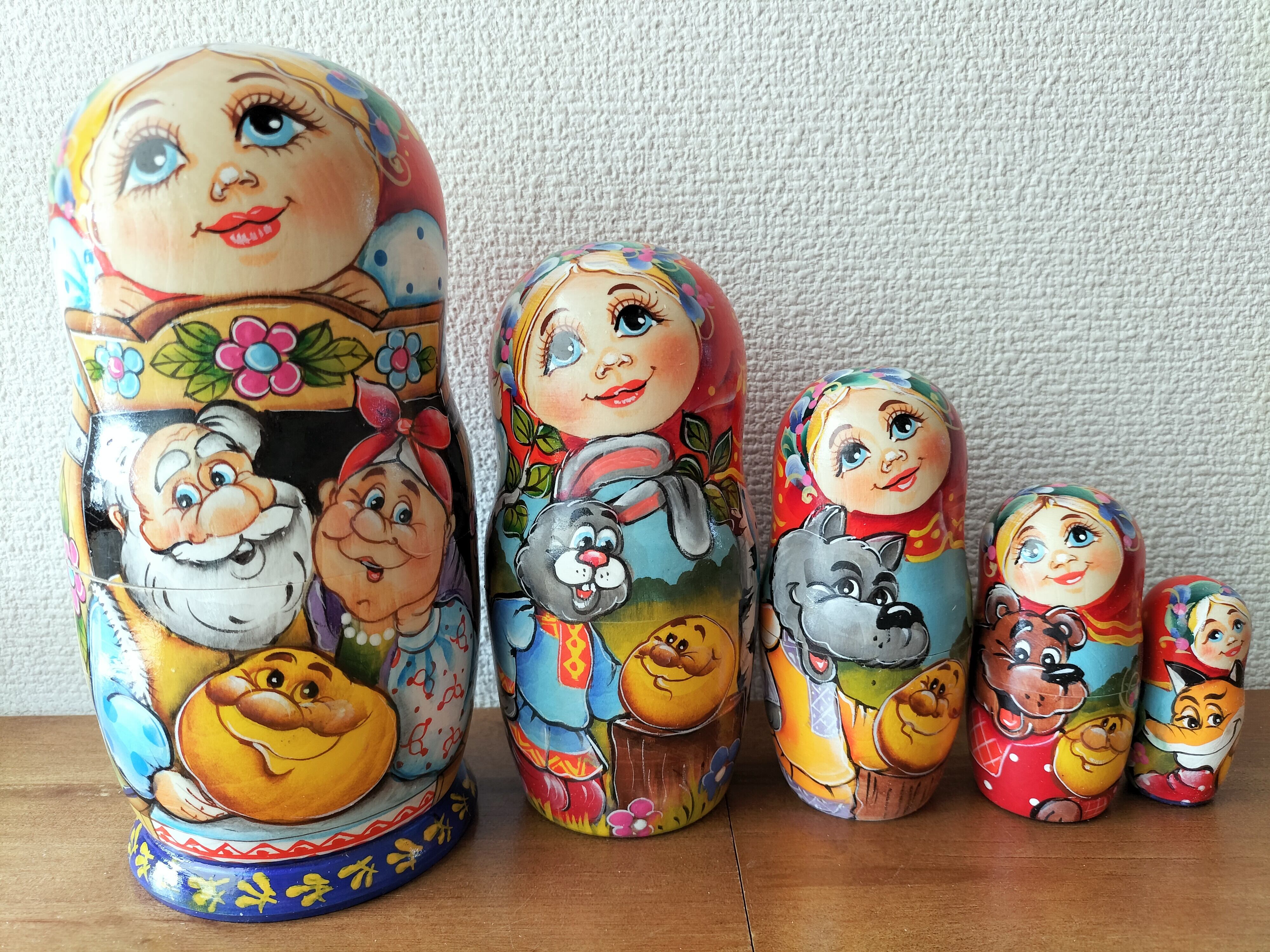 ロシアのナターリアさんとエカテリーナという2人組の作家さんから直接譲り受けたマトリョーシカです。おだんごぱんをモチーフにしています。