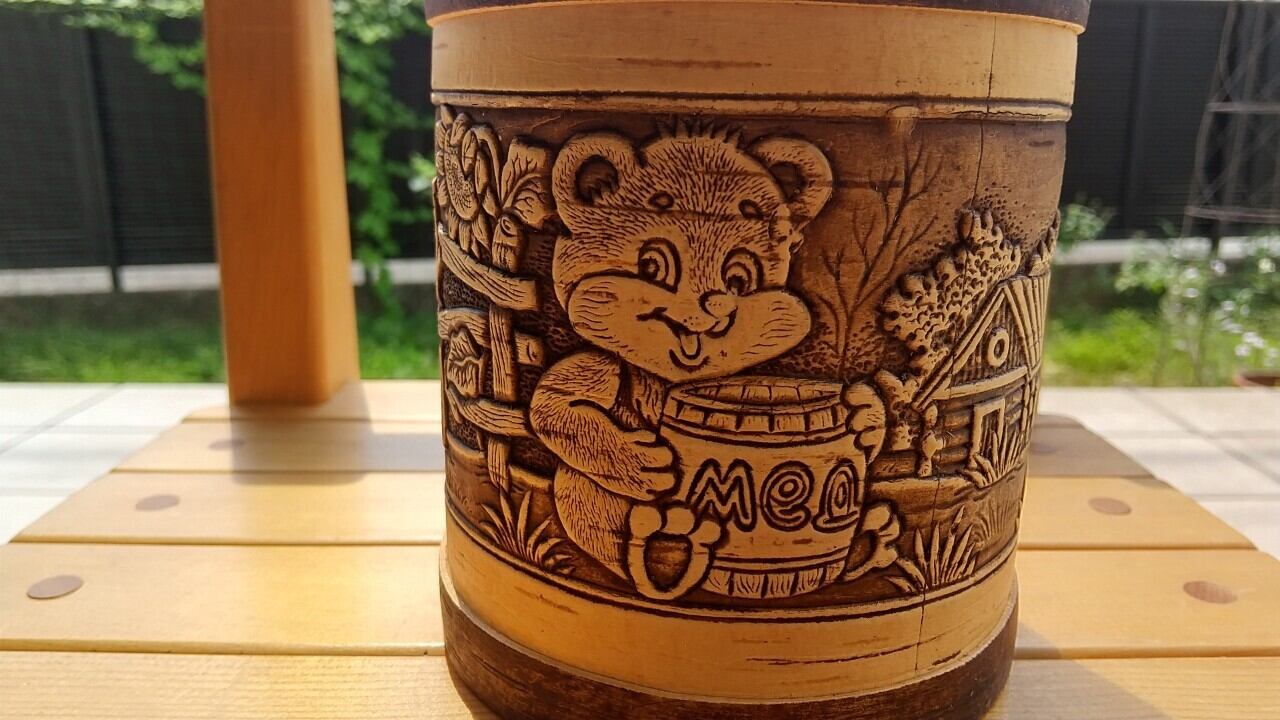 【BE027】北欧ロシア雑貨、ベレスタ・白樺の小物入れ/キャニスター 蜂蜜とくま