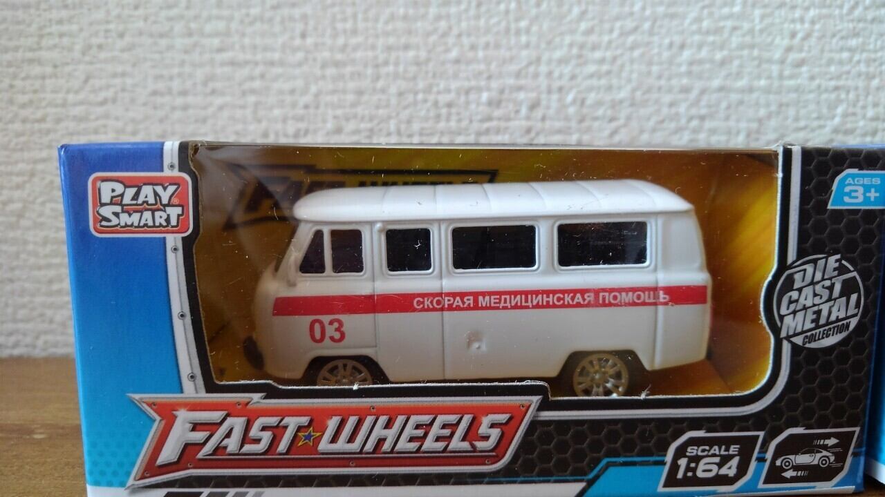 ロシアのミニカー(モデルカー)です。ウリヤノフスク自動車工場(ワズ社)の、愛称が「ブハンカ」というUAZ39625、マイクロバスの車種です。交通警察(青)と緊急医療車両の特殊車両2台セット、バラ売り不可です。