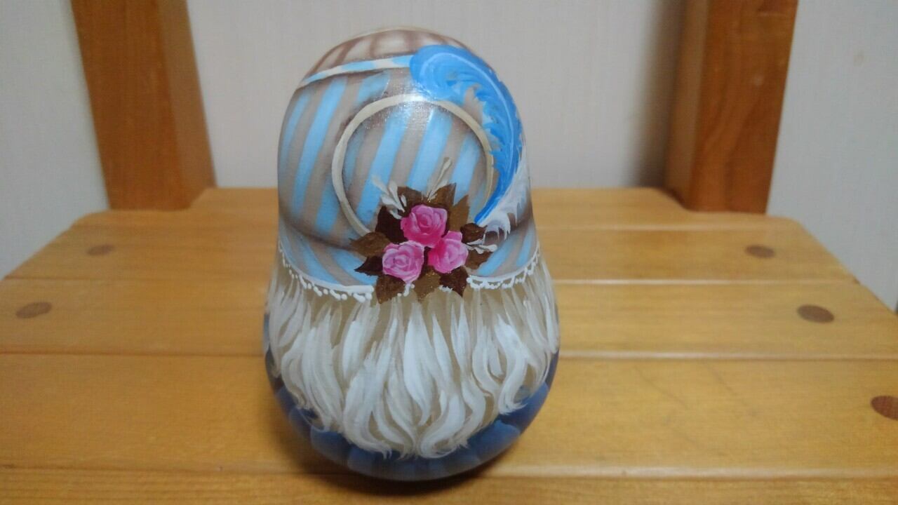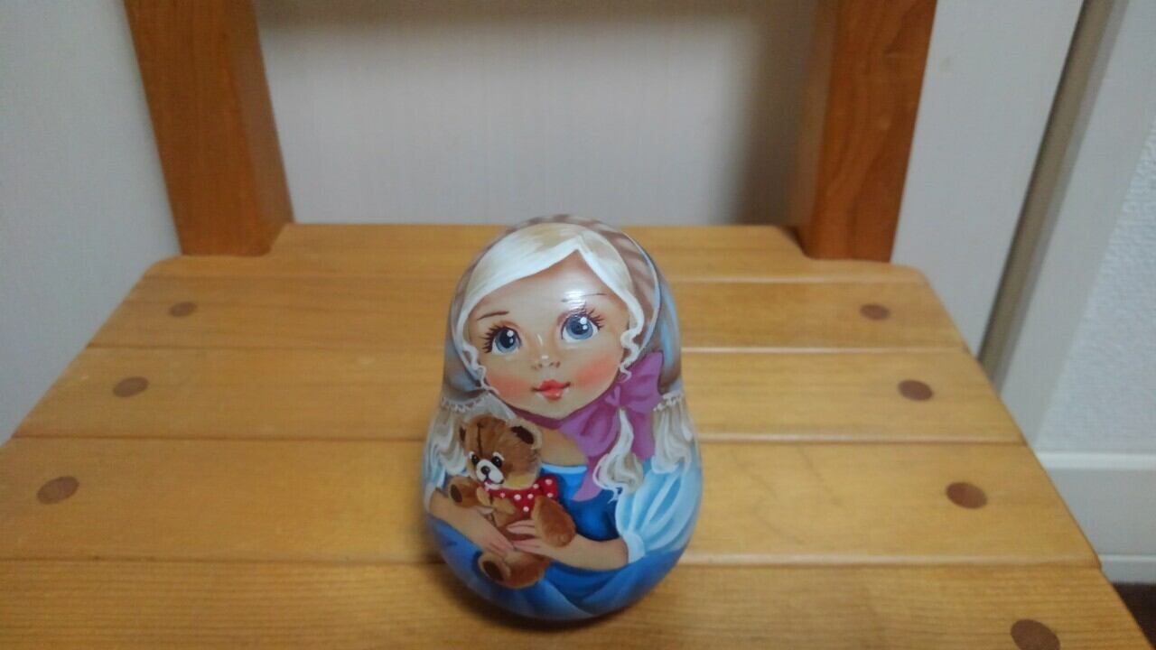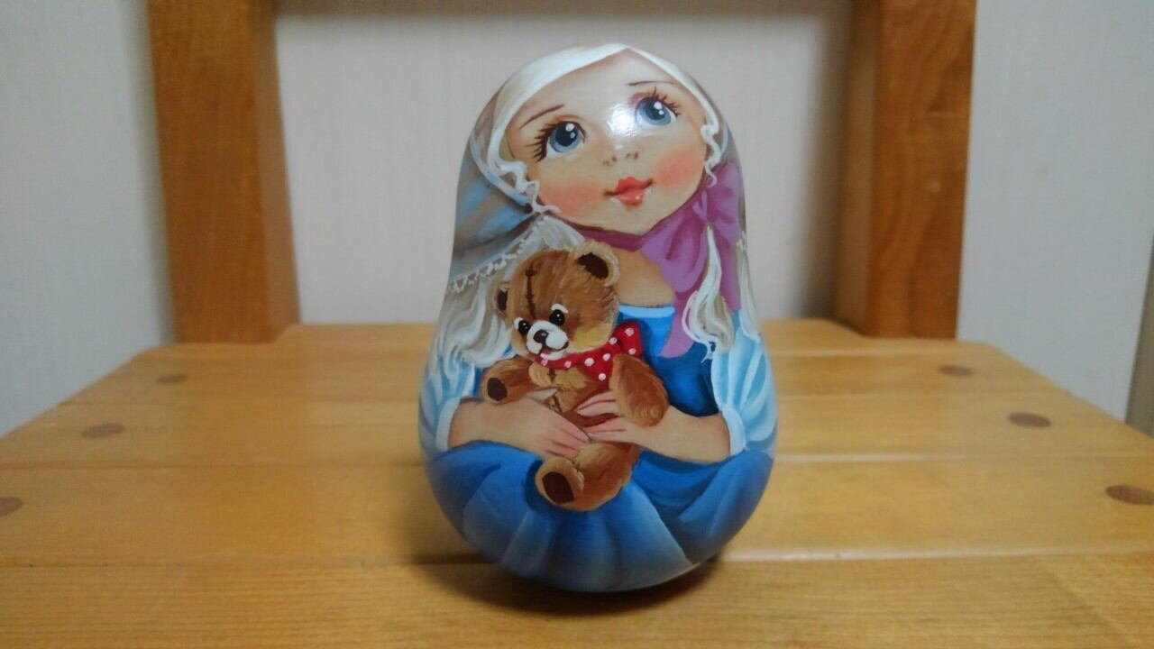 ロシアで有名なスヴェトラーナ・ニコラエヴァという作家さんから直接譲り受けた起き上がりこぼしです。くまのぬいぐるみをもった女の子をモチーフにしています。転がすと、カランコロンと音が出ます。