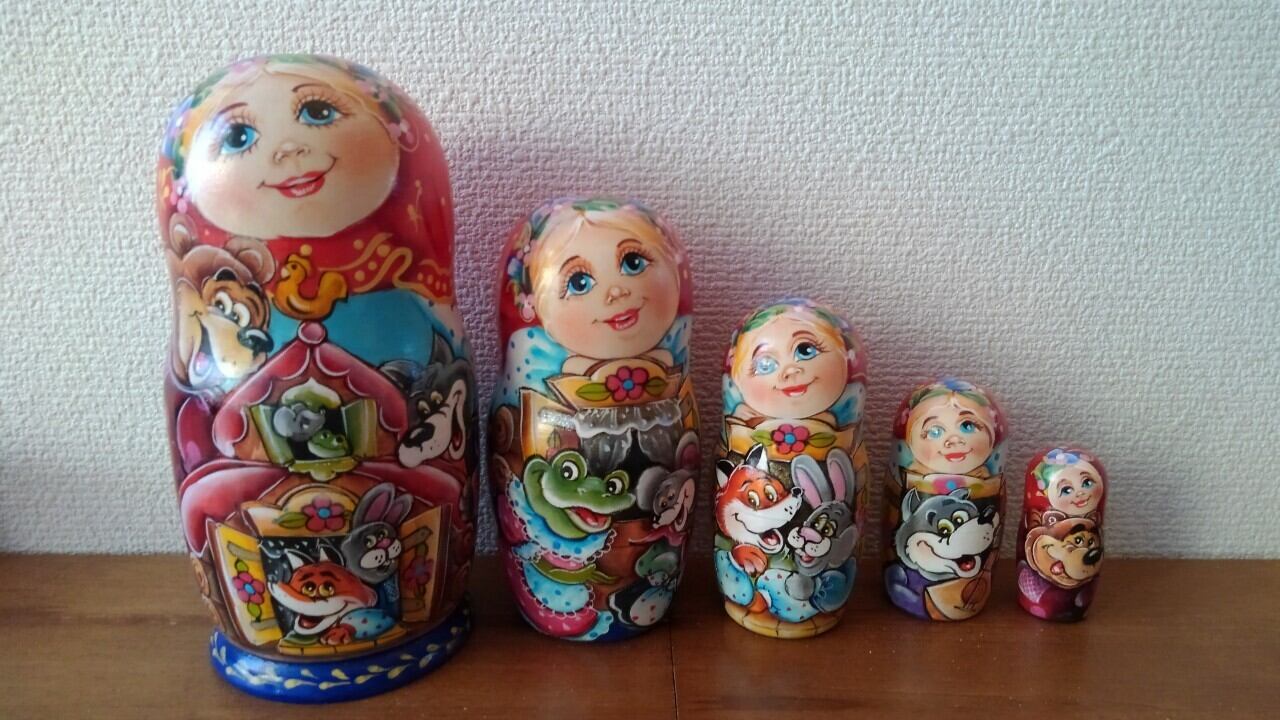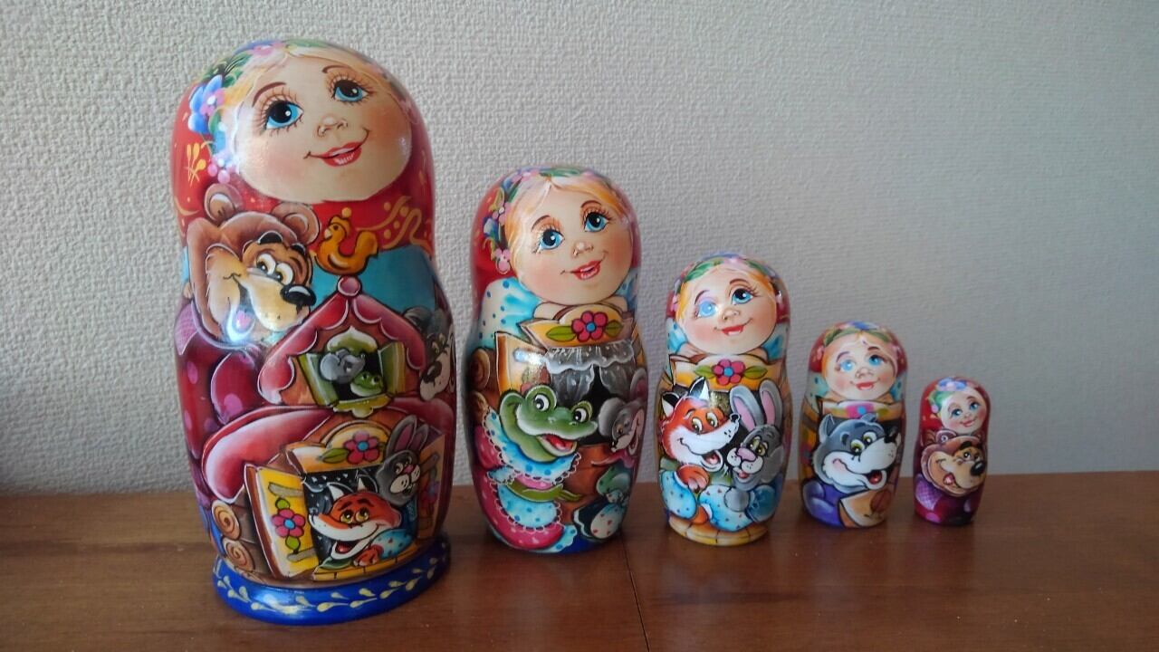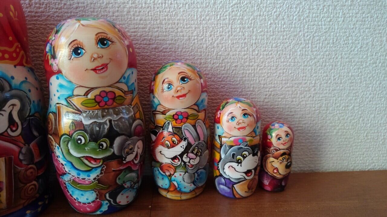 ロシアのナターリアさんとエカテリーナという2人組の作家さんから直接譲り受けたマトリョーシカです。ロシアの代表的な童話『テレモーク』(小さなお家)をモチーフにしています。