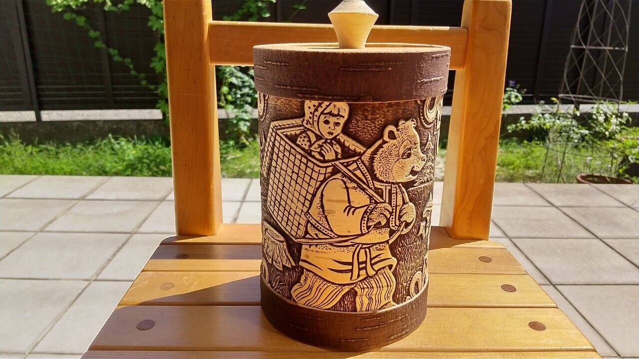 ロシア・北欧の小物入れ、ベレスタです。白樺の真皮で作られている白樺細工です。童話のマーシャとくまをモチーフにしています。ベレスタ職人のハンドメイド作品です。大きいサイズのキャニスターです。