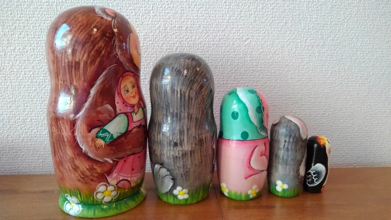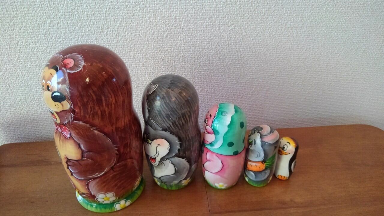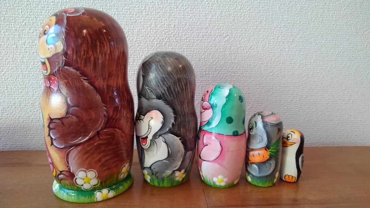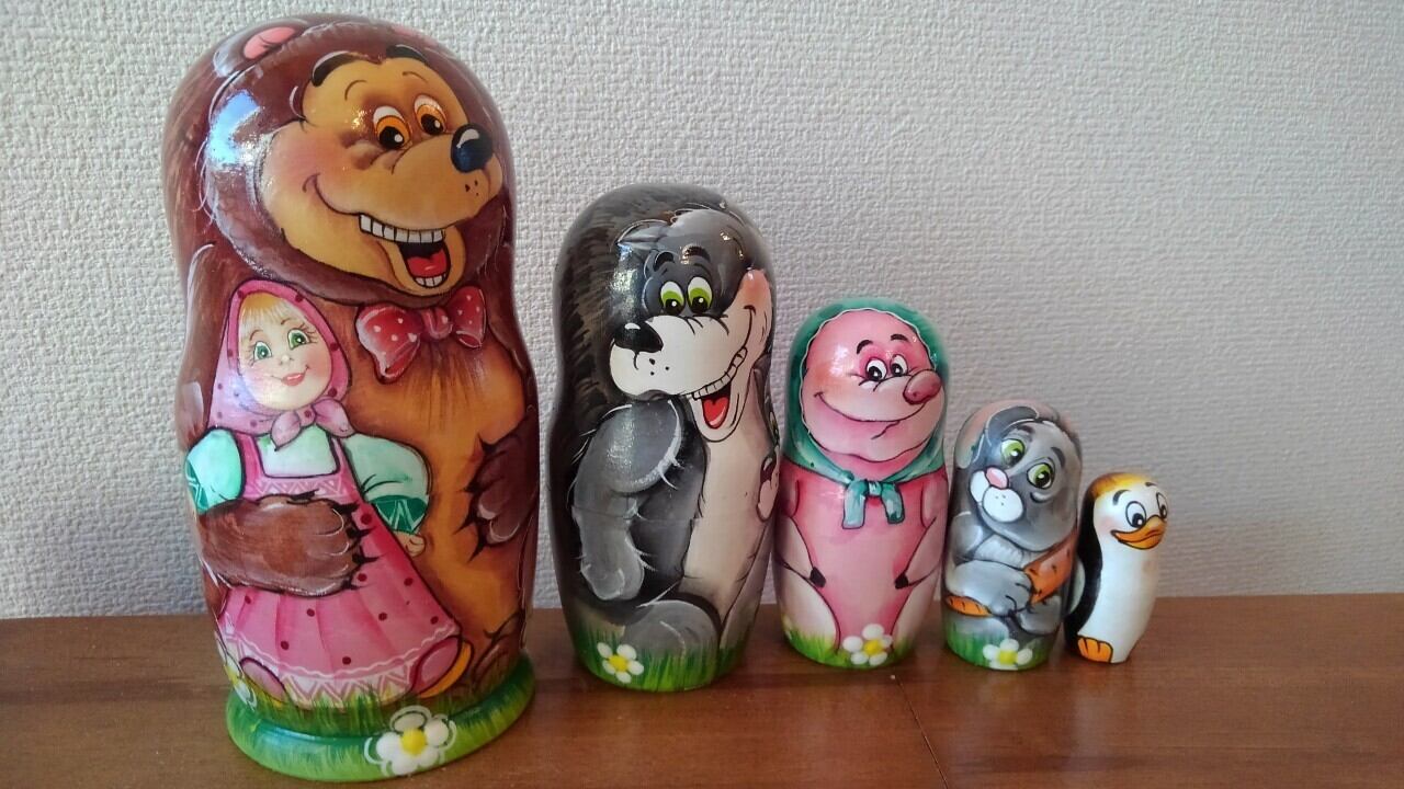 ロシアのナターリアさんとエカテリーナという2人組の作家さんから直接譲り受けたマトリョーシカです。ロシアアニメ「マーシャとくま」がモチーフとなっております。