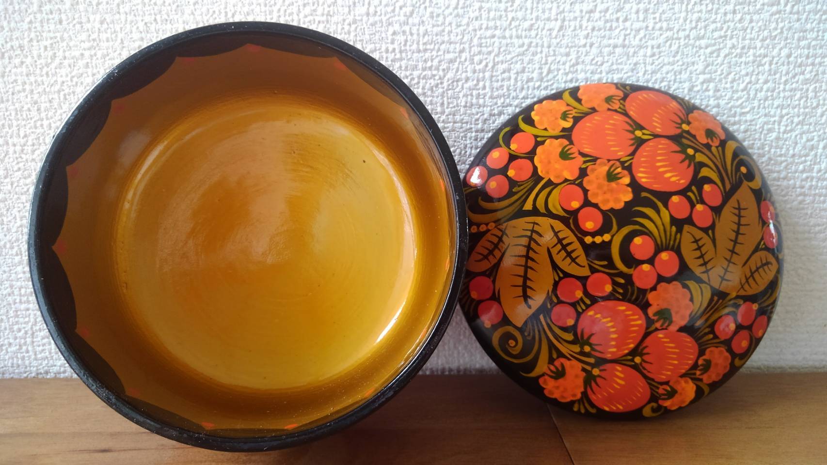 ロシアの主要な伝統工芸品であるホフロマ塗の小鉢、入れ物です。ホフロマ村という地域が発祥の民芸品です。