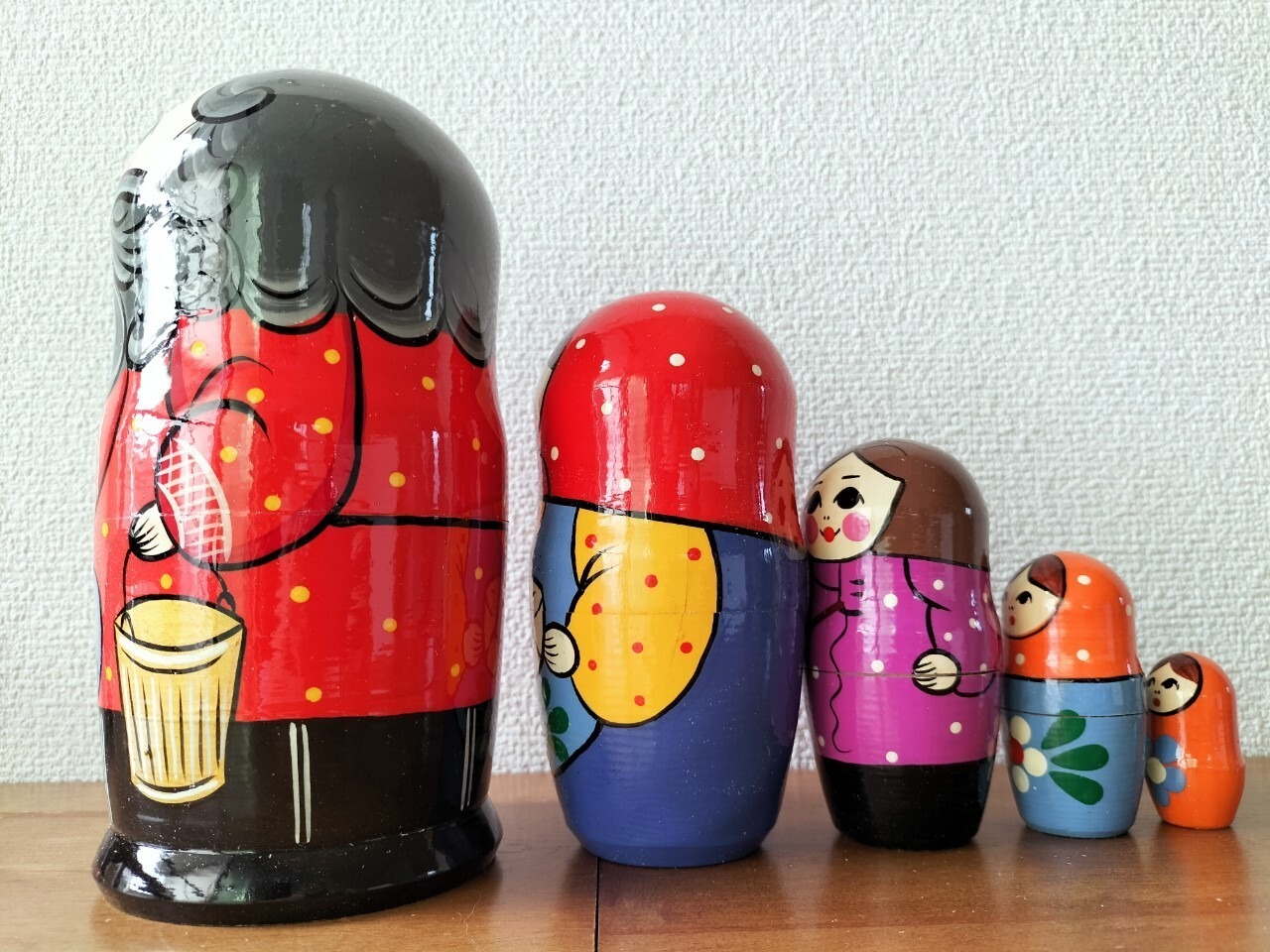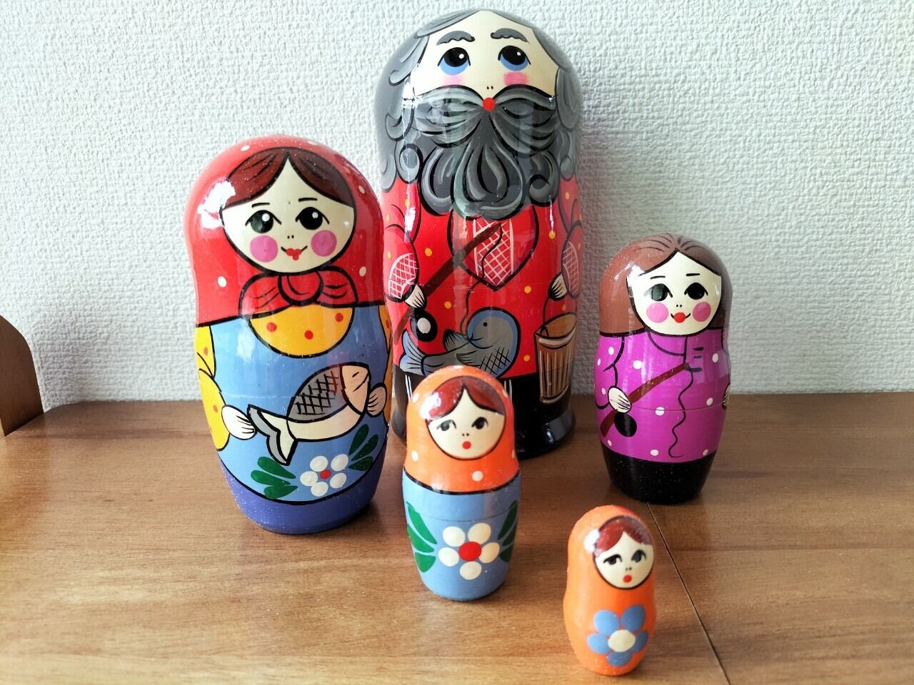 魚釣りをモチーフにしたロシアの職人さんによるハンドメイドの作品です。ロシア伝統の原色系べた塗りのカラフルな木製工芸品・マトリョーシカです。自然木の香りがします。