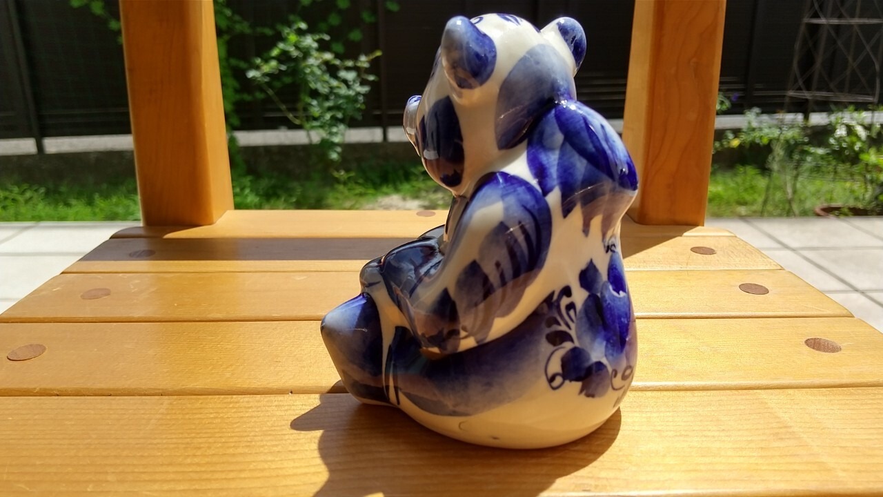 ロシアの伝統陶器、グジェリ焼きです。ハチミツをむさぼるクマをモチーフにしています。